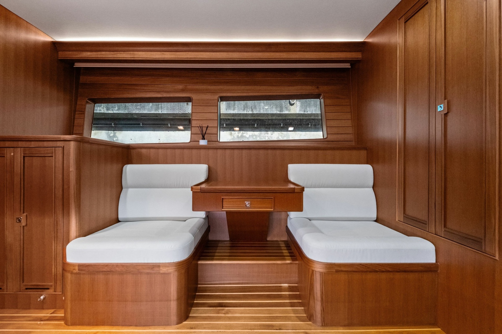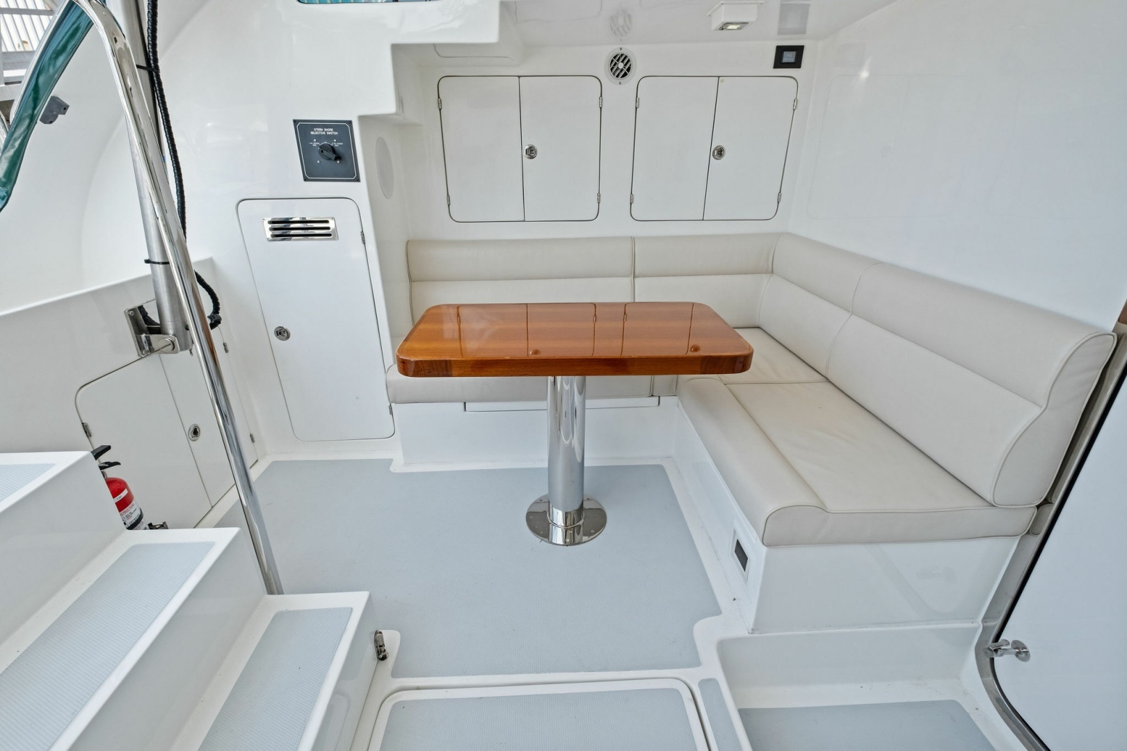 - Large seating area forward with two tables and storage underneath