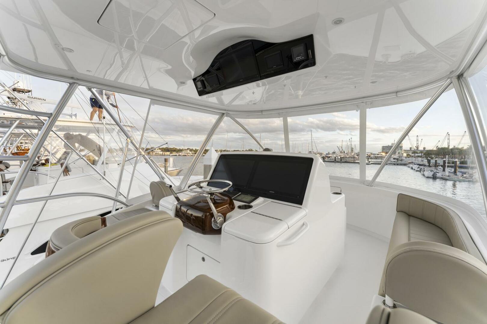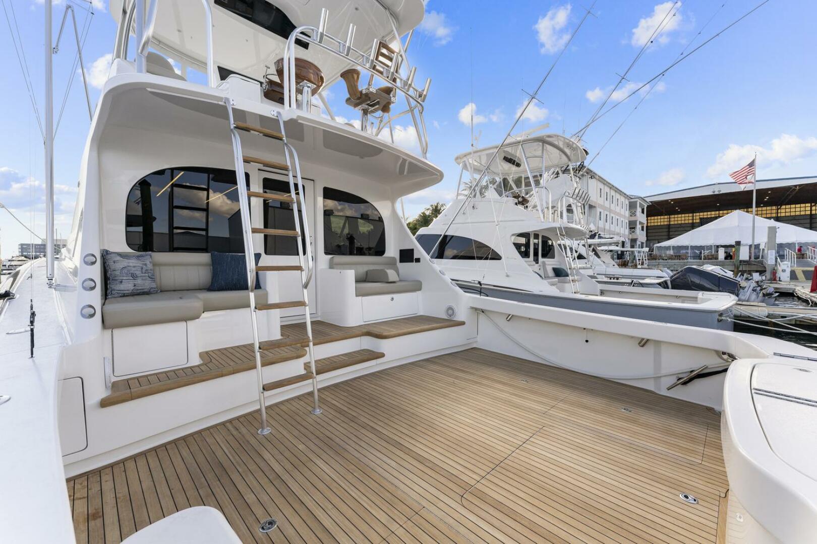 One of the defining features of the Viking 50 Billfish is its expansive 170-square-foot cockpit, offering the space and functionality typically found on much larger sportfishing yachts. The cockpit is equipped with large fish boxes, a tackle center, refrigerated and freezer storage, and a drink box, creating an efficient workspace for offshore fishing. The mezzanine seating area provides excellent visibility of the cockpit action while adding comfort for guests, including a port-side lounge and deep seating.