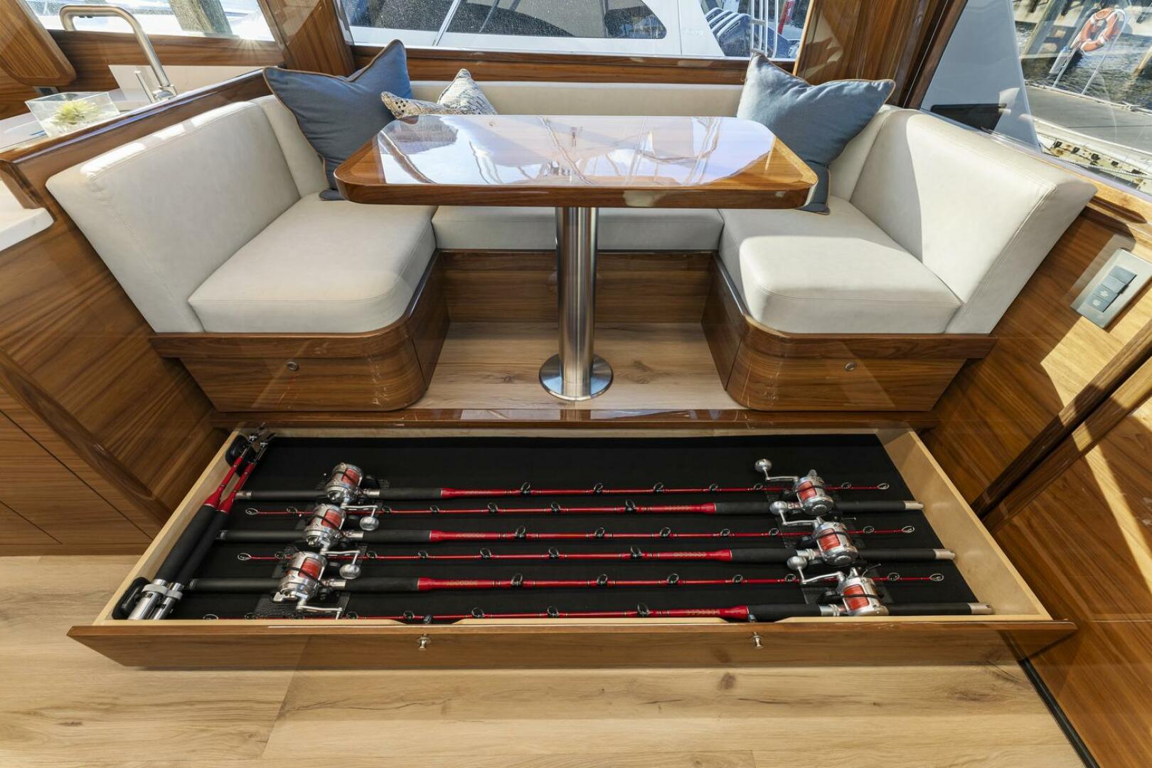 Inside, the salon follows a practical day-boat style layout designed for comfort and utility. A portside lounge offers a relaxing space after a day on the water, while a raised dinette to starboard includes rod storage below. The split galley forward provides ample counter space, storage, and room for multiple refrigerator and freezer units, making it easy to provision for extended trips.