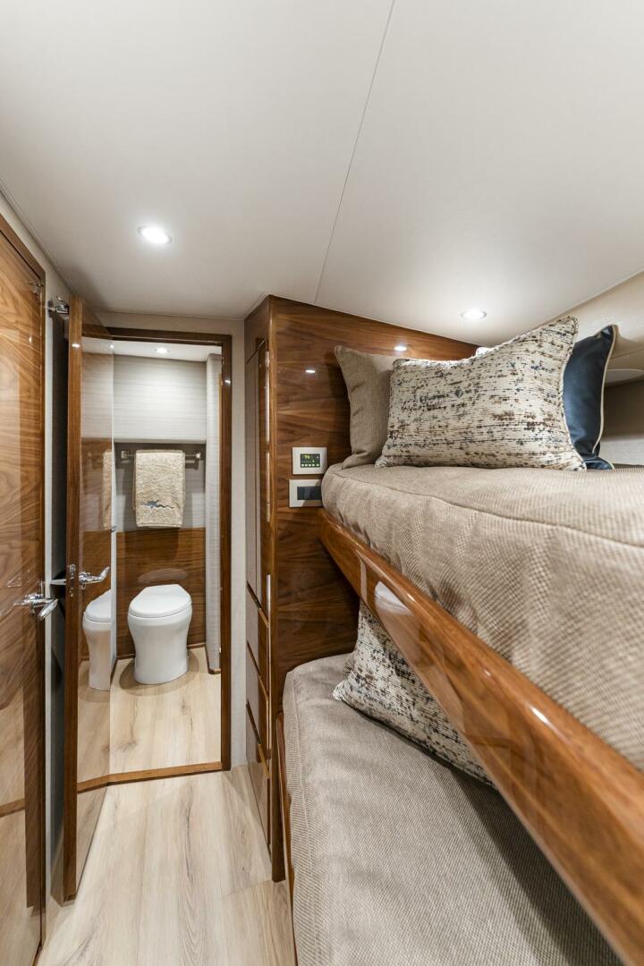 The Viking 50 Billfish features a two-stateroom layout that maximizes functionality for owners and guests. The forward master stateroom includes a walkaround queen berth and a private ensuite head. A second guest stateroom to port features upper and lower bunks and access to a shared head that also serves as the day head. An additional open area can be configured with extra bunks or customized as a dedicated rod-and-tackle center.