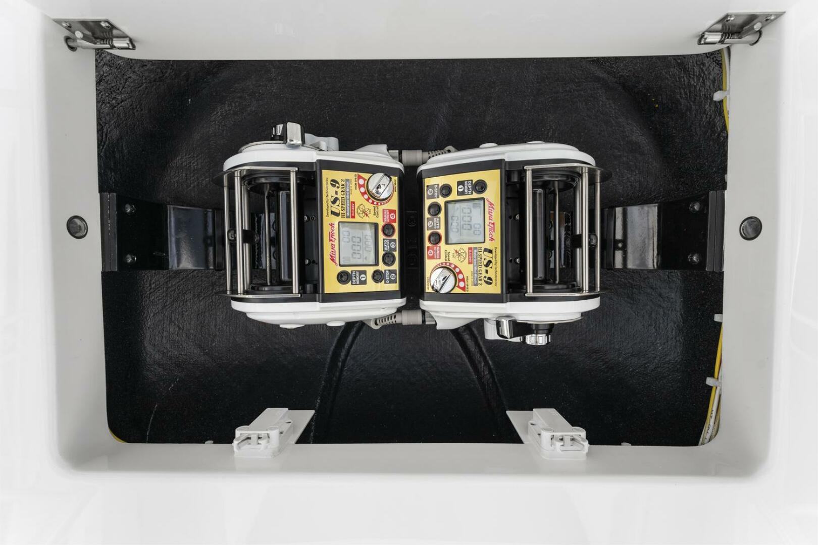 Up top, the inset flybridge delivers a sporty profile while maintaining excellent space and visibility. The center-console style helm provides a walkaround layout favored by tournament anglers, offering clear sightlines when backing down on fish. The flybridge also includes guest seating, storage, and a refrigerated drink box for added convenience.