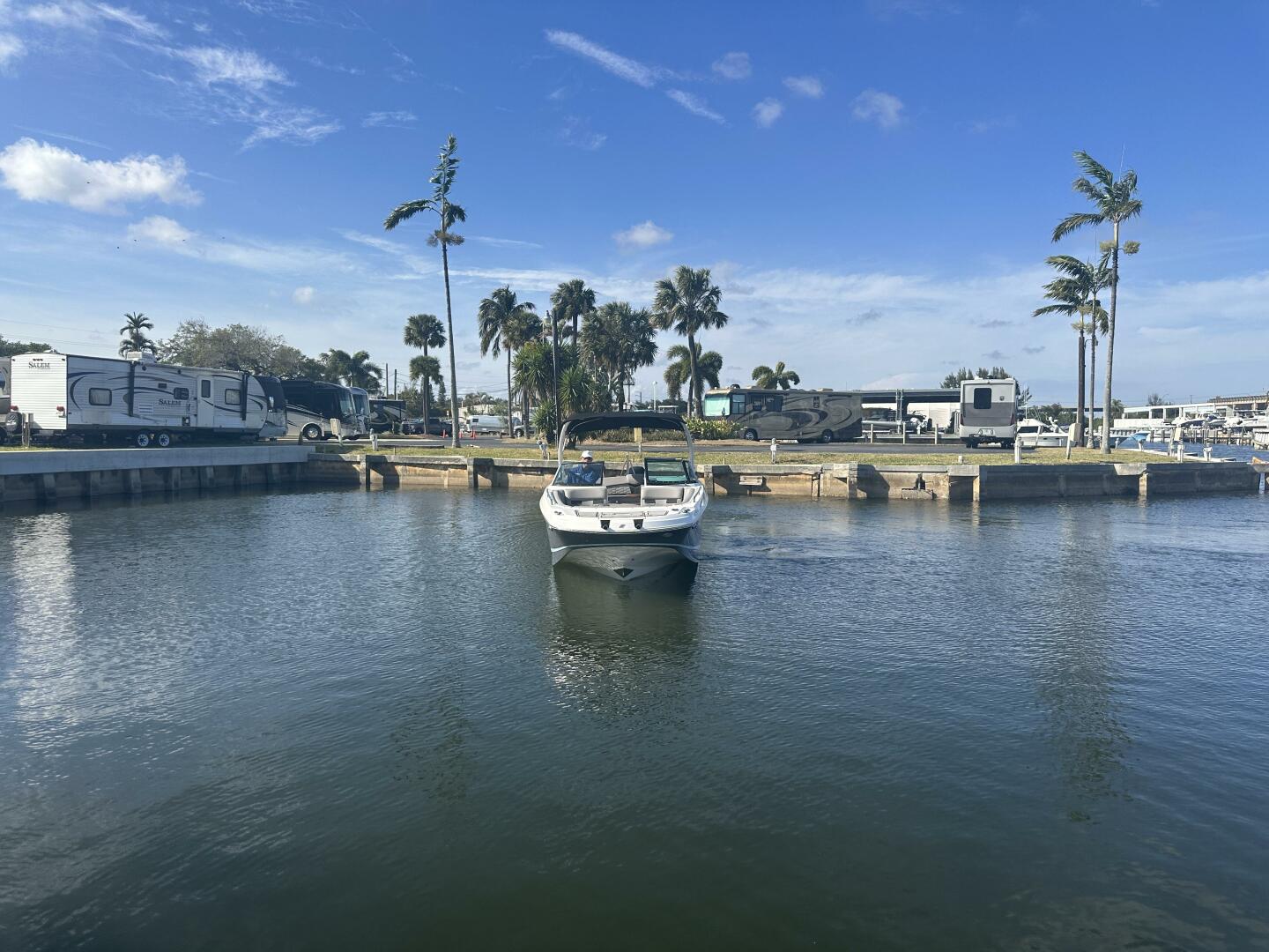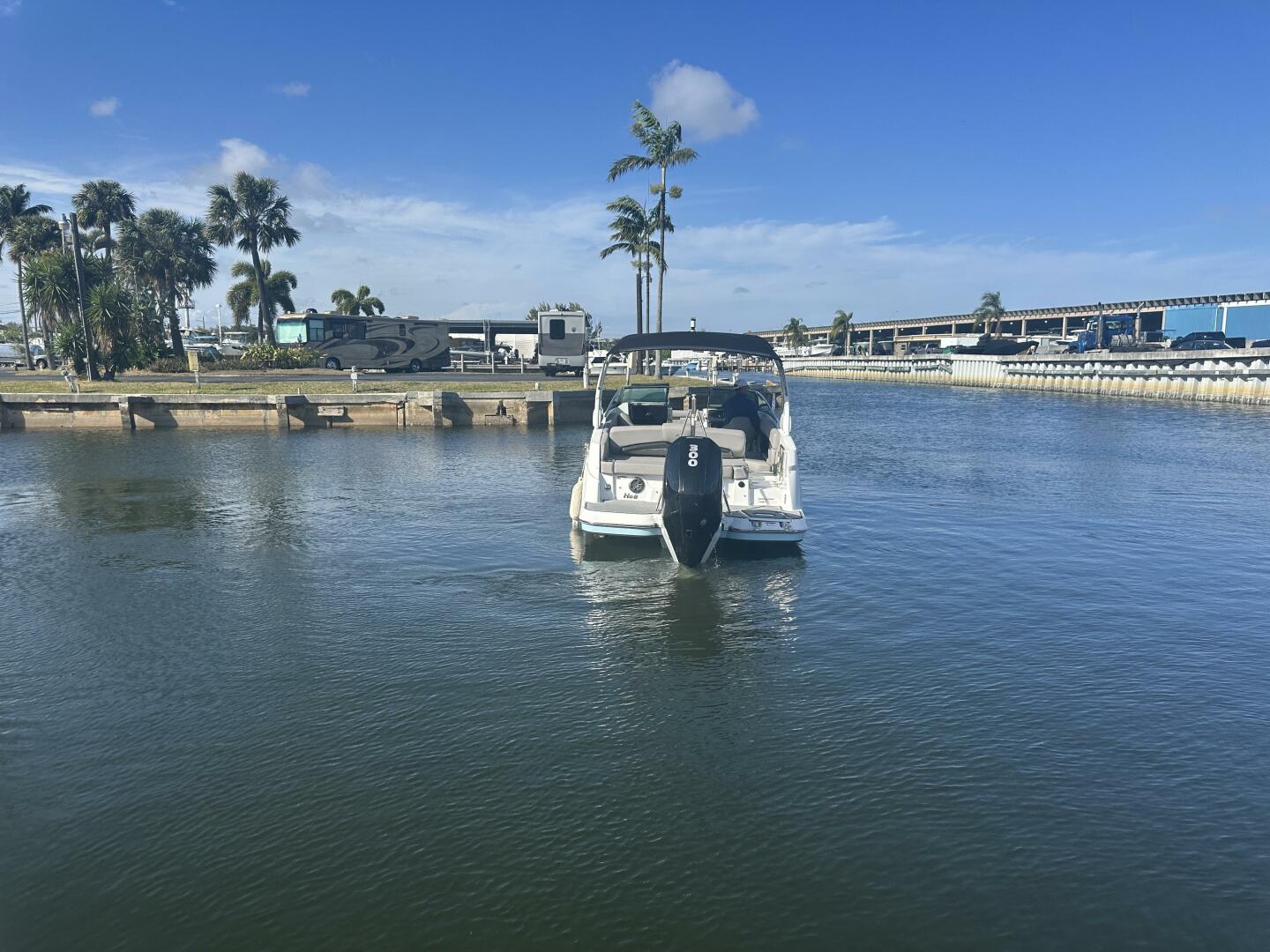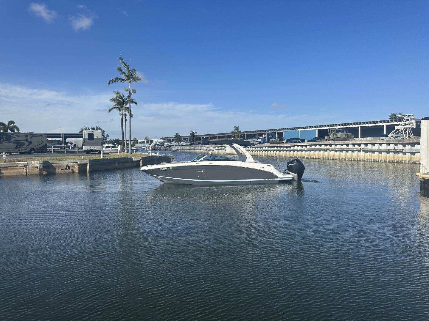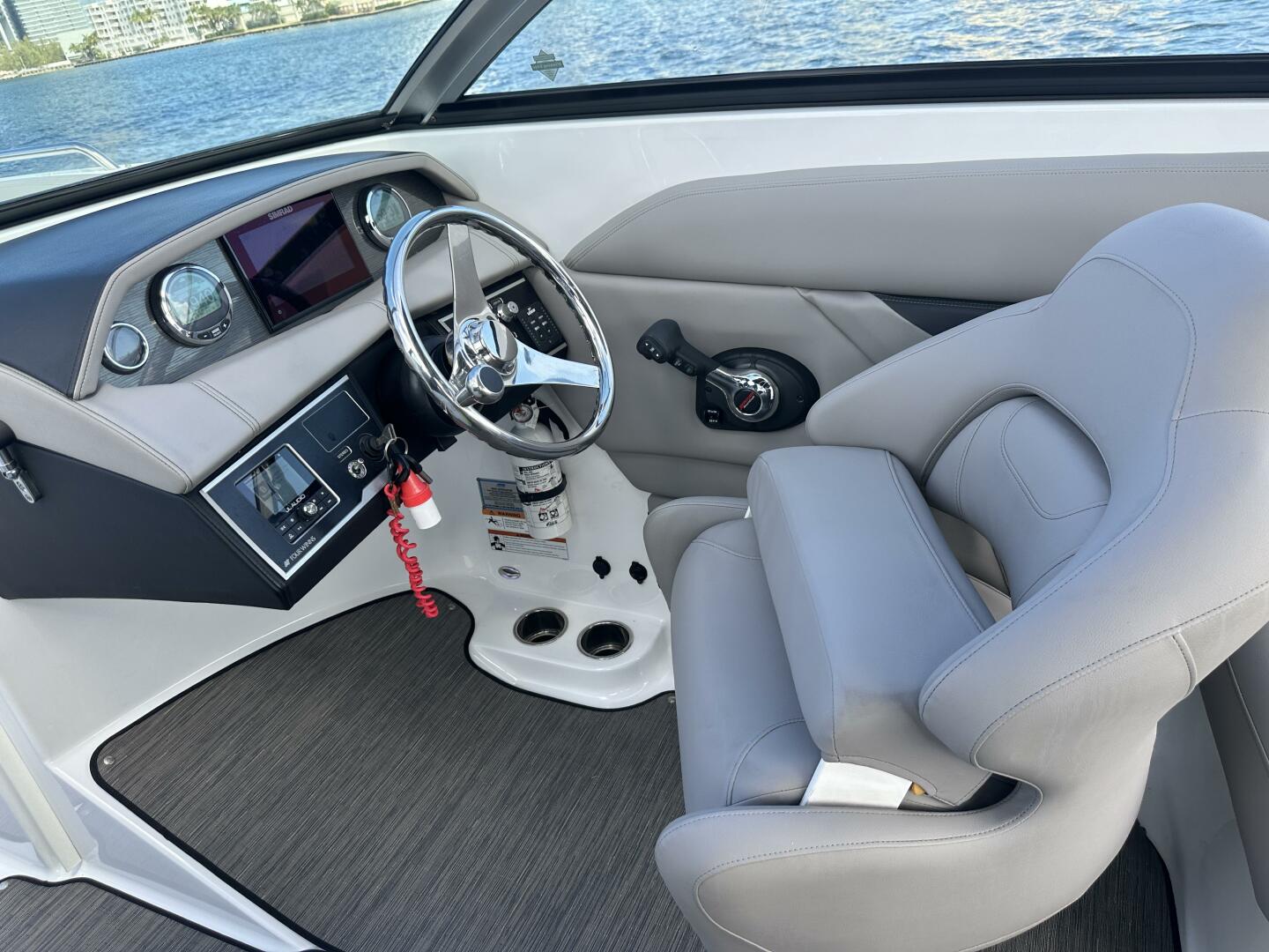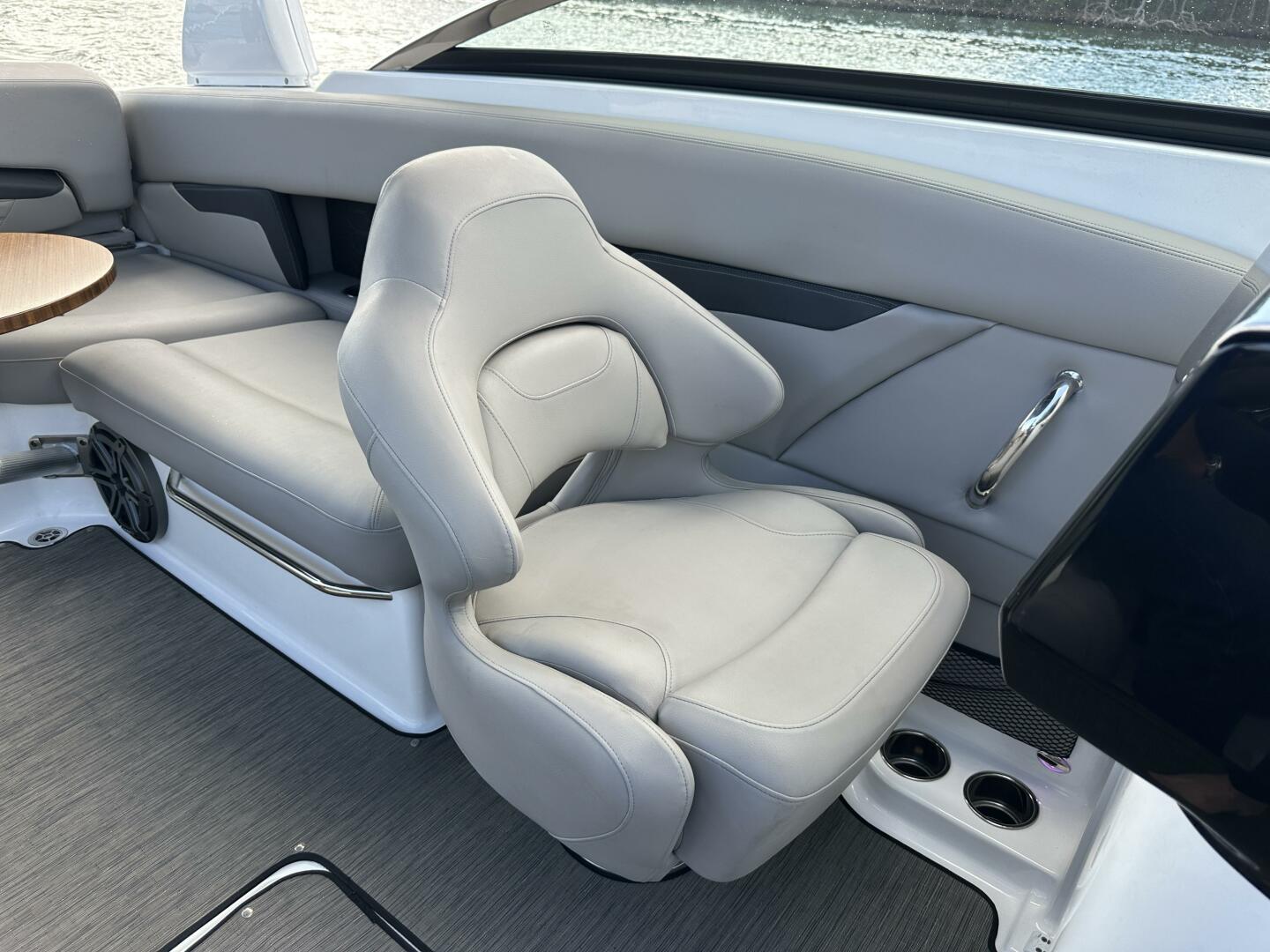 At the helm, you’ll find a modern, well-appointed captain’s station featuring a touchscreen display, digital engine controls, stainless accents, and ergonomic seating that provides excellent visibility and confidence underway with its low-profile windshiel. The Mercury 300 delivers strong acceleration, smooth cruising speeds, and reliable power for watersports or longer runs. Whether you’re cruising the Intracoastal, heading to the sandbar, casting a line or making a run to your favorite waterfront restaurant, this boat handles beautifully in a variety of conditions.