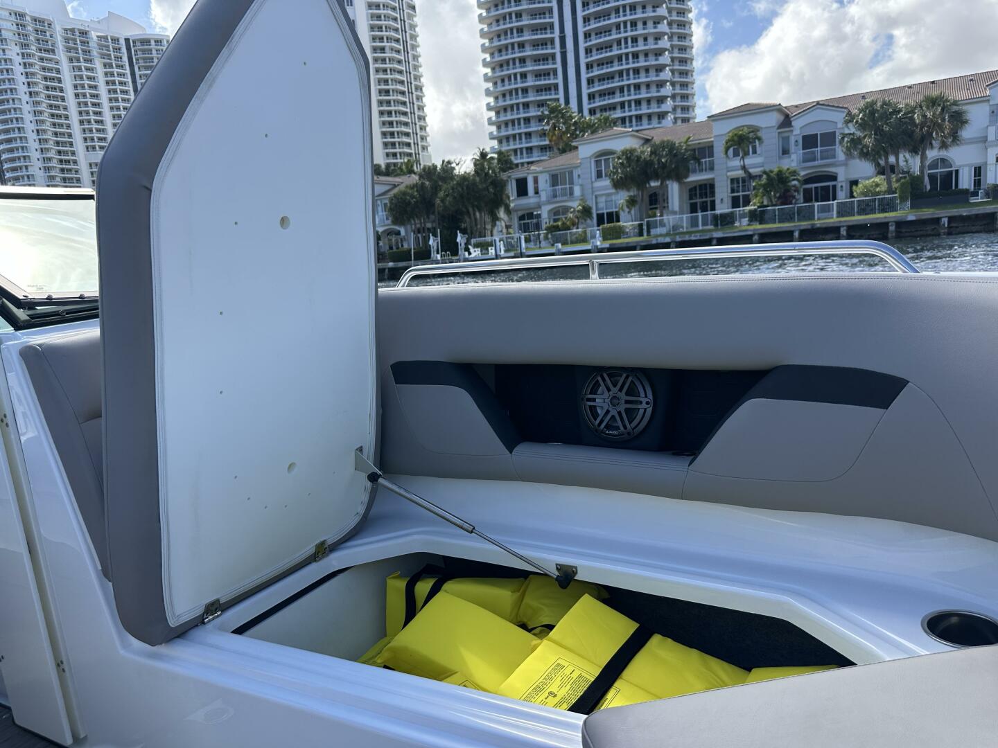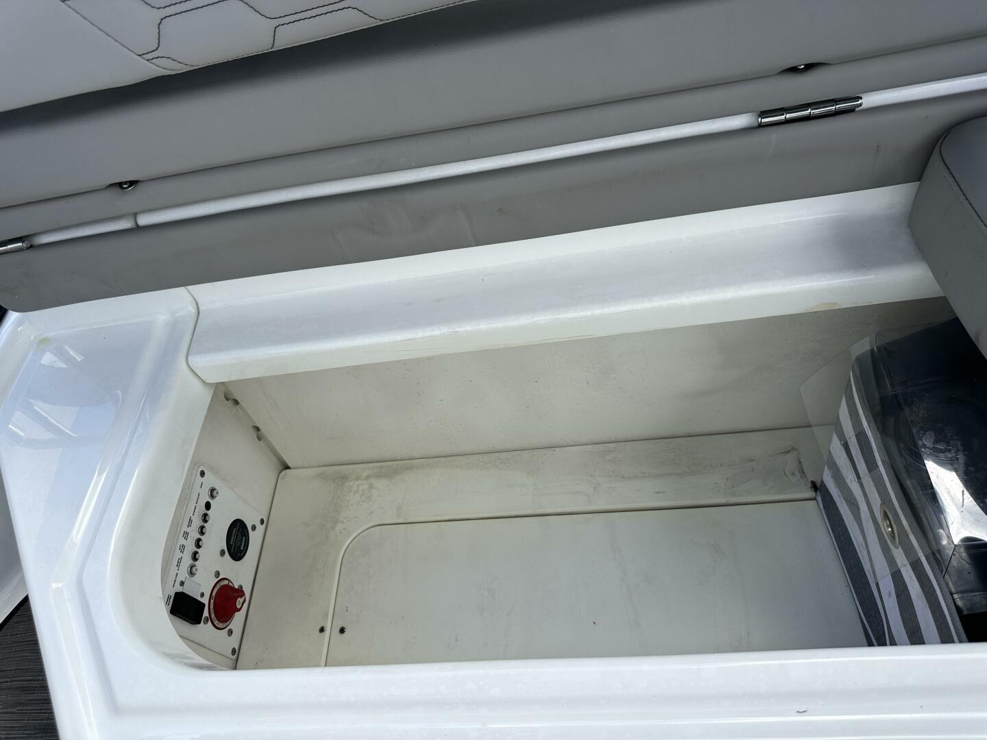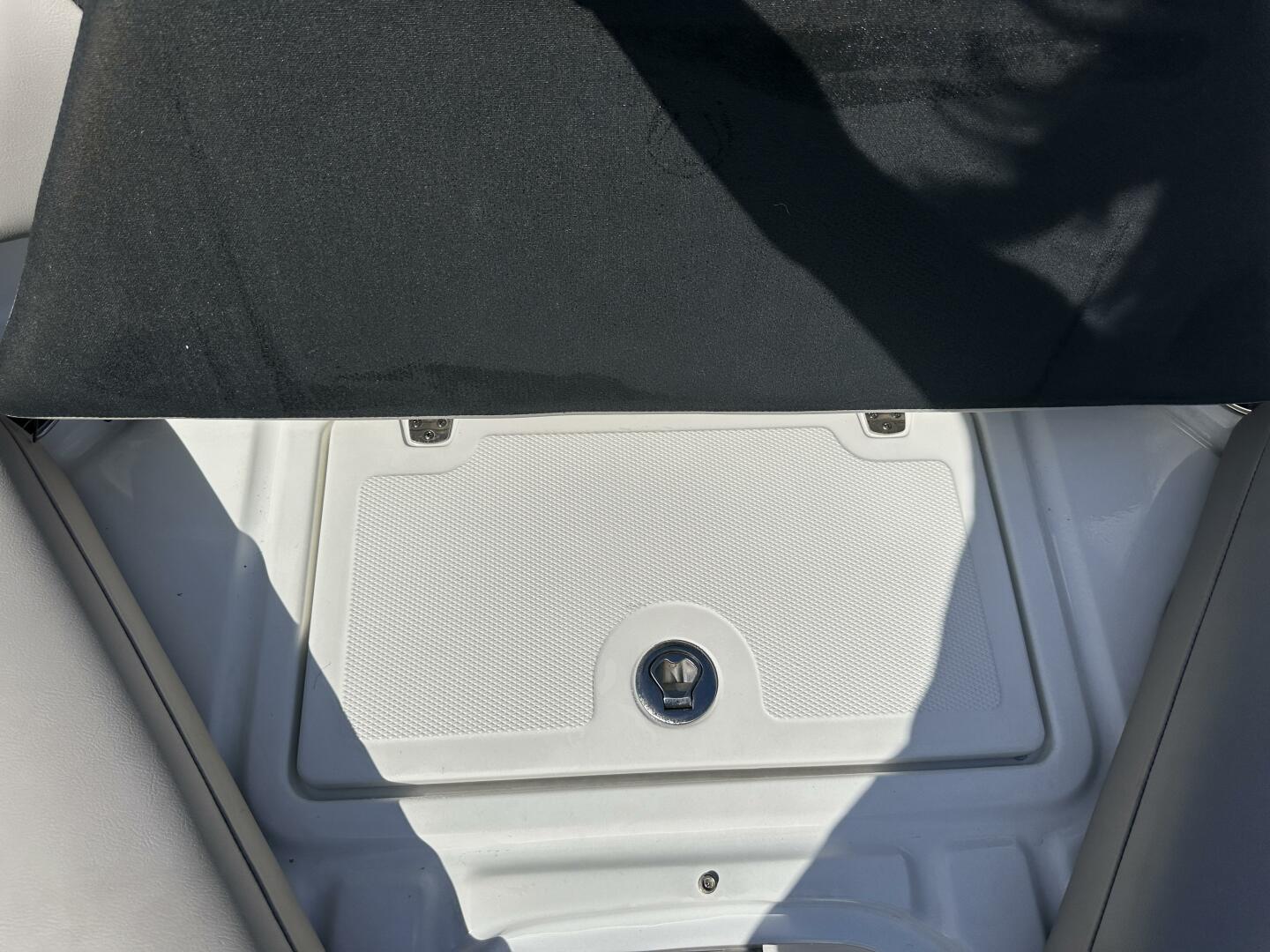 - Storage, bow, behind backrest at helm