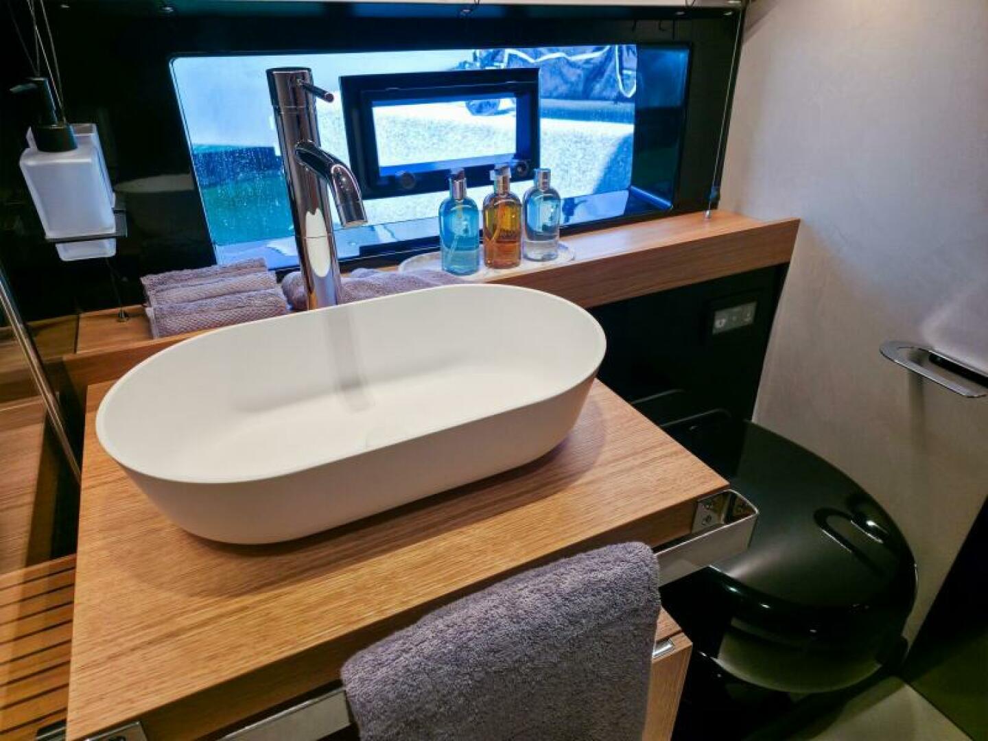 Below deck, the D60 offers a customizable layout with 2–3 staterooms, up to 2 bathrooms, and a dedicated crew cabin. The full-beam owner’s suite features a lounge, desk, walk-in wardrobe, and an ensuite bath with a separate shower. The forward VIP can be configured as a single suite or split into twin guest cabins. A midship galley links the salon and accommodations, giving the interior a loft-like, open feel.