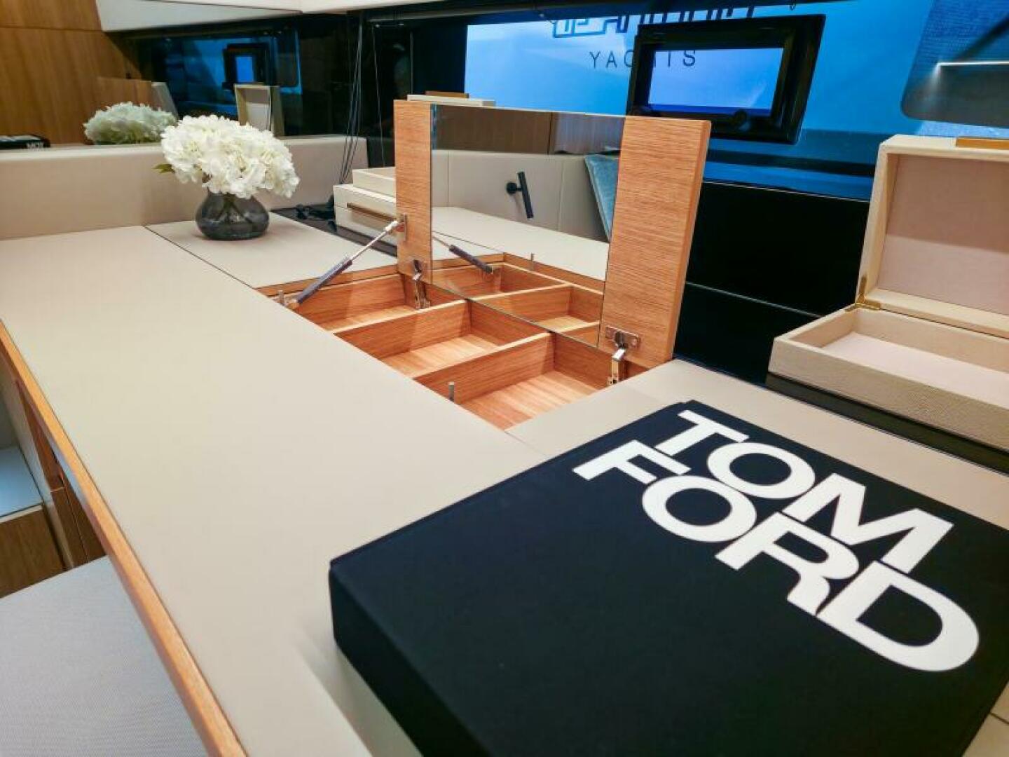 On deck, a true walk-around layout creates three distinct entertaining zones: a spacious aft terrace with a sunbed and wet bar, a shaded dining area under a custom hardtop, and a versatile foredeck with convertible seating and an optional hidden Jacuzzi. Expansive glass and sliding doors allow the main deck salon to flow seamlessly into the outdoors, while abundant natural light floods the interior.