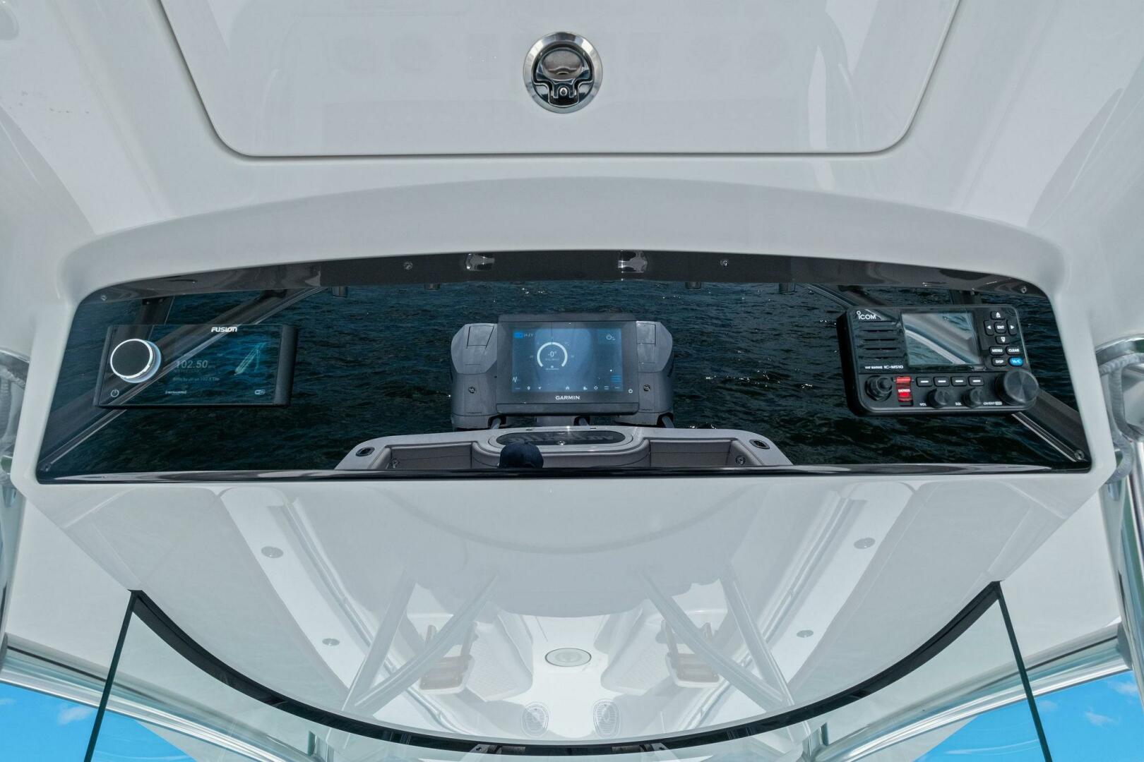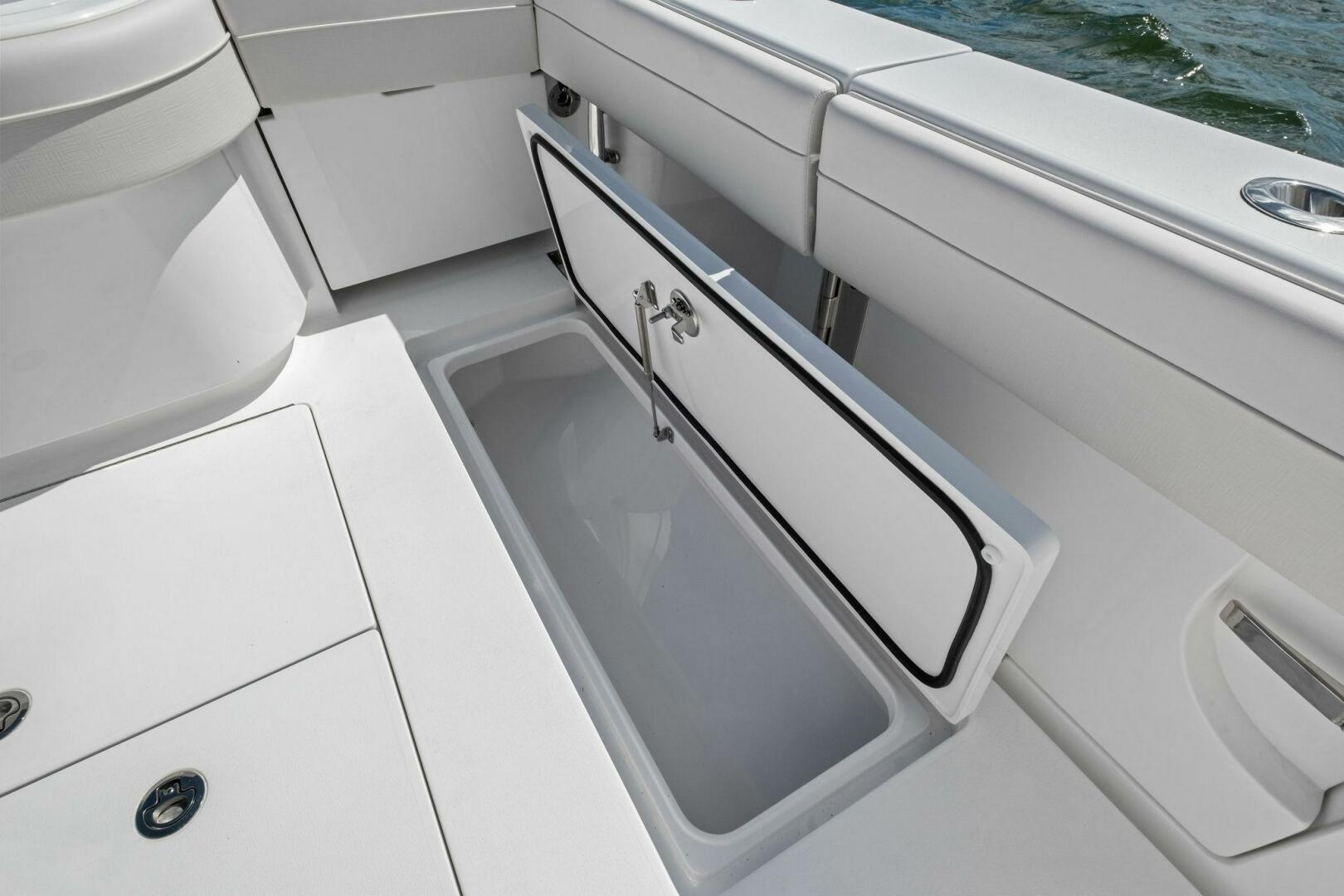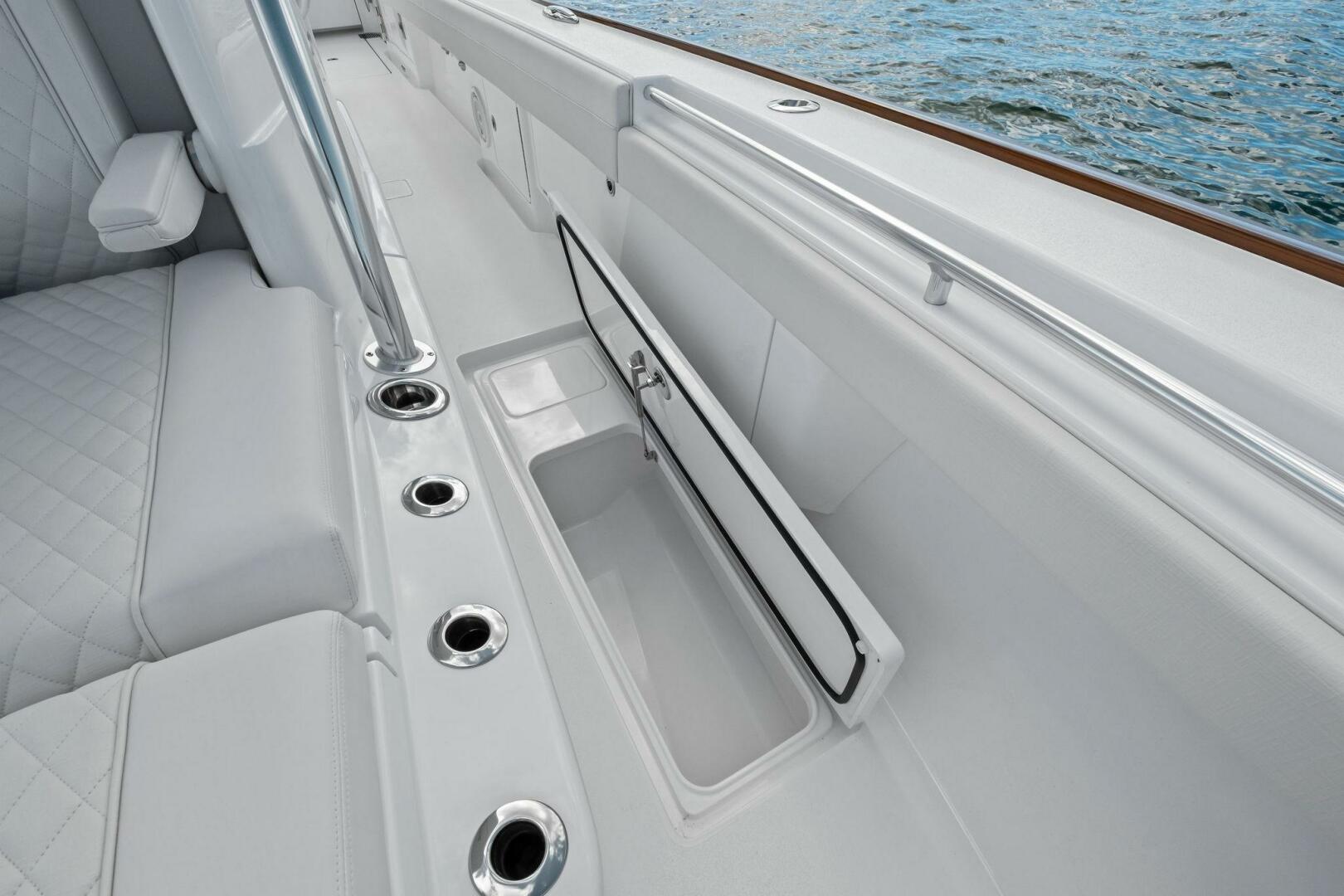 Forward, you’ll find a spacious console lounge, with the option to add port and starboard seating with forward‑facing backrests for unmatched comfort. Inside the console, you'll appreciate convenient access to rod storage, a head and sink, and all critical electronics and systems.