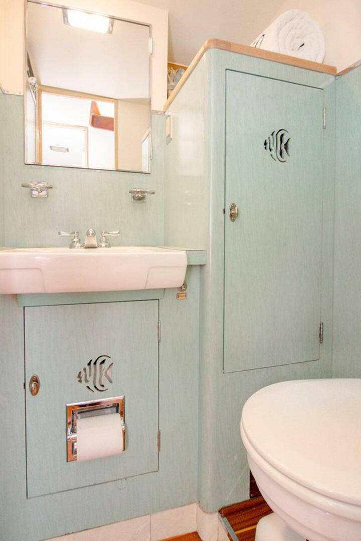 Her construction reflects the finest traditions of wooden sportfishing yachts, featuring mahogany planking over cedar with bronze fastenings and white oak framing. The hull has been epoxy sealed and finished throughout, preserving the integrity of her classic structure while enhancing durability beyond original build standards.