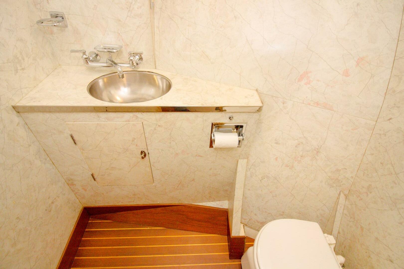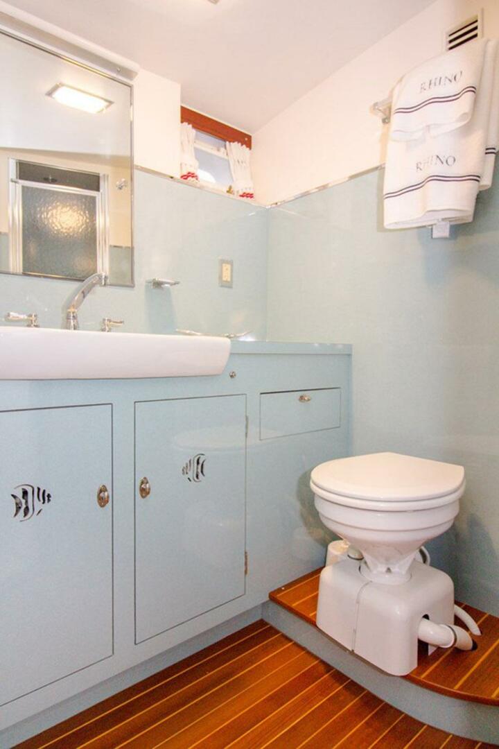 The interior offers a well-appointed three-stateroom layout, including a full-beam master aft with private head and direct cockpit access, guest accommodations amidships, and crew quarters forward. The salon maintains the warm elegance expected of a classic yacht, featuring an L-Shaped settee with custom hi-low table, traditional joinery, and thoughtful detailing throughout. The galley and dinette retain the authentic Rybovich aesthetic with original cabinetry and modern appliances.