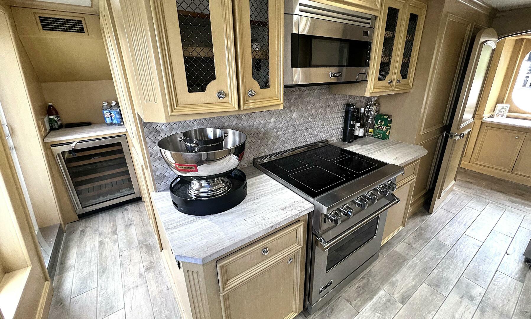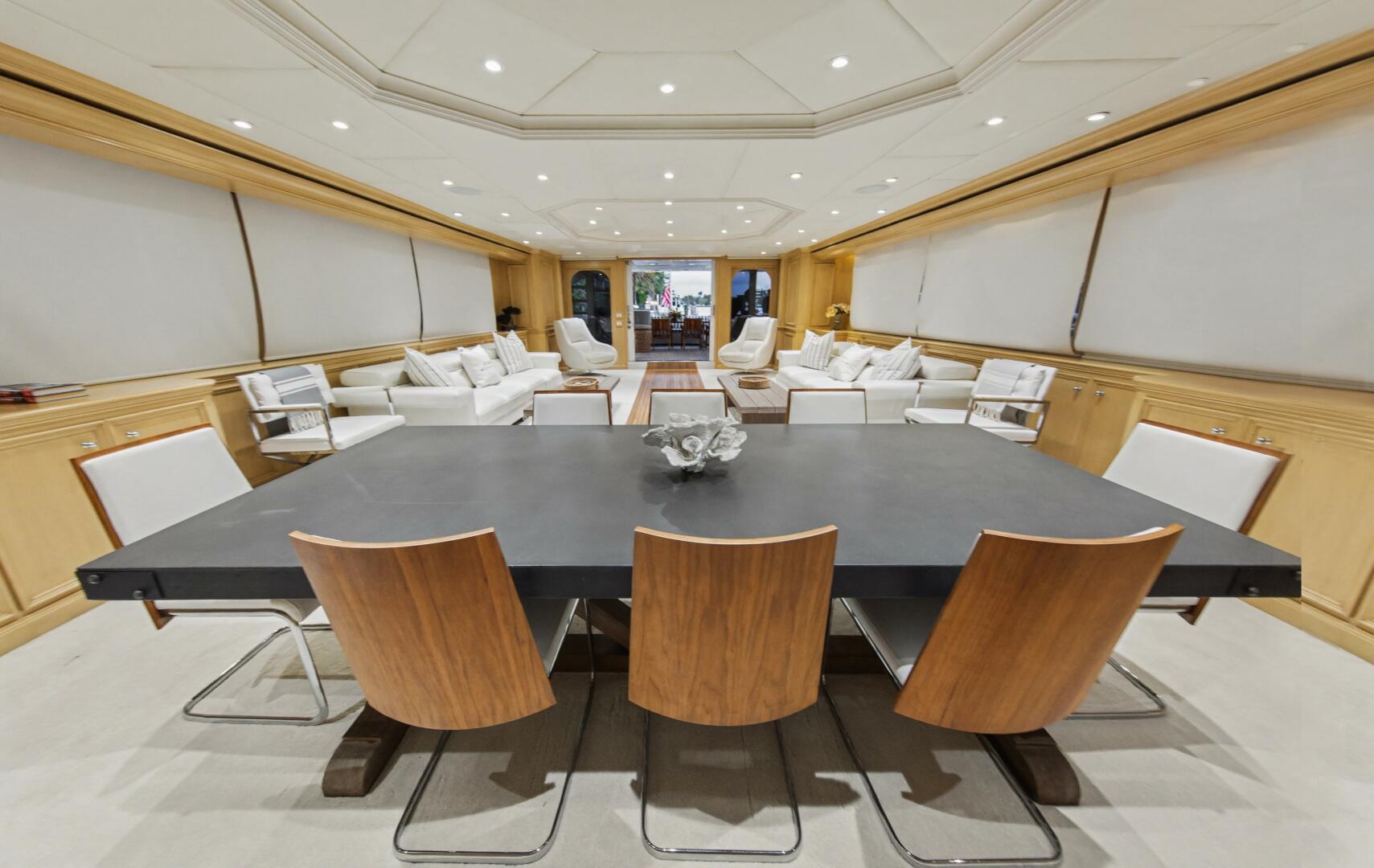 The main salon was redesigned to create a more open, inviting living space, and the layout was reconfigured to incorporate a spacious country kitchen on the main deck, featuring additional cooking equipment, a central island, and a large L-shaped dinette. The original galley remains in place as a serving galley while maintaining full functionality.