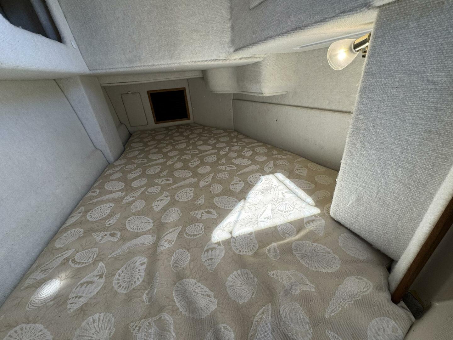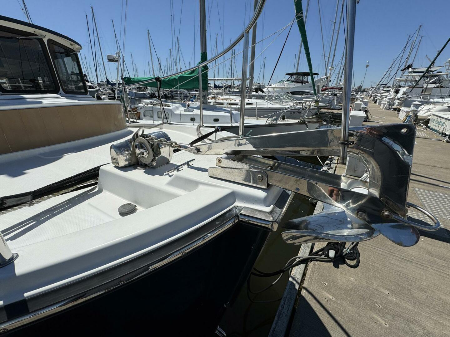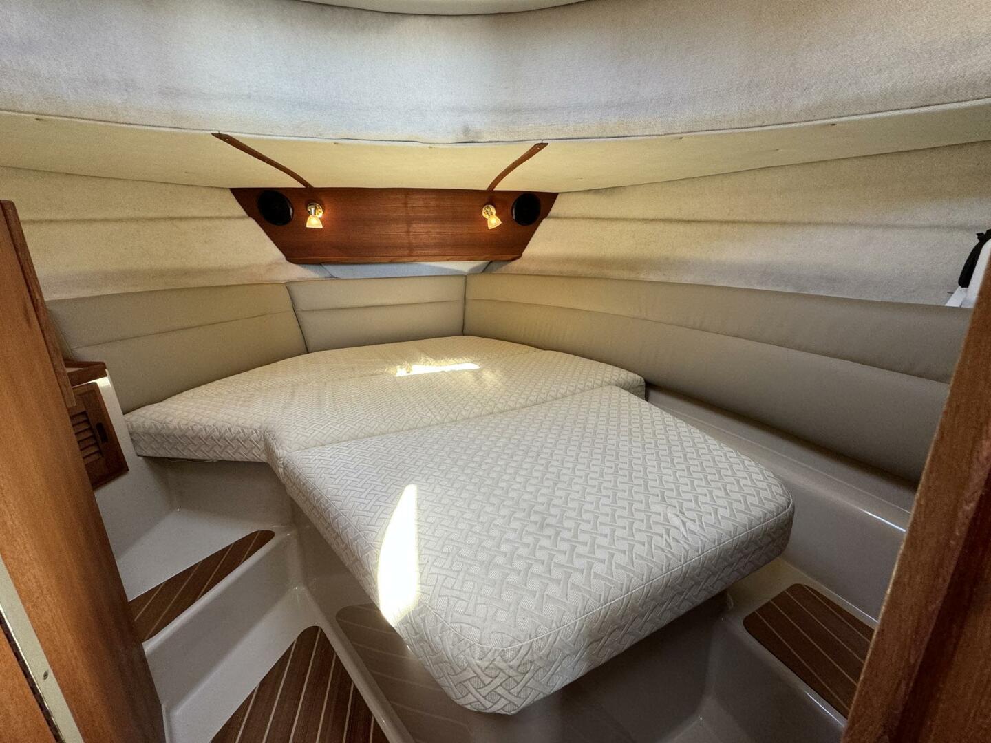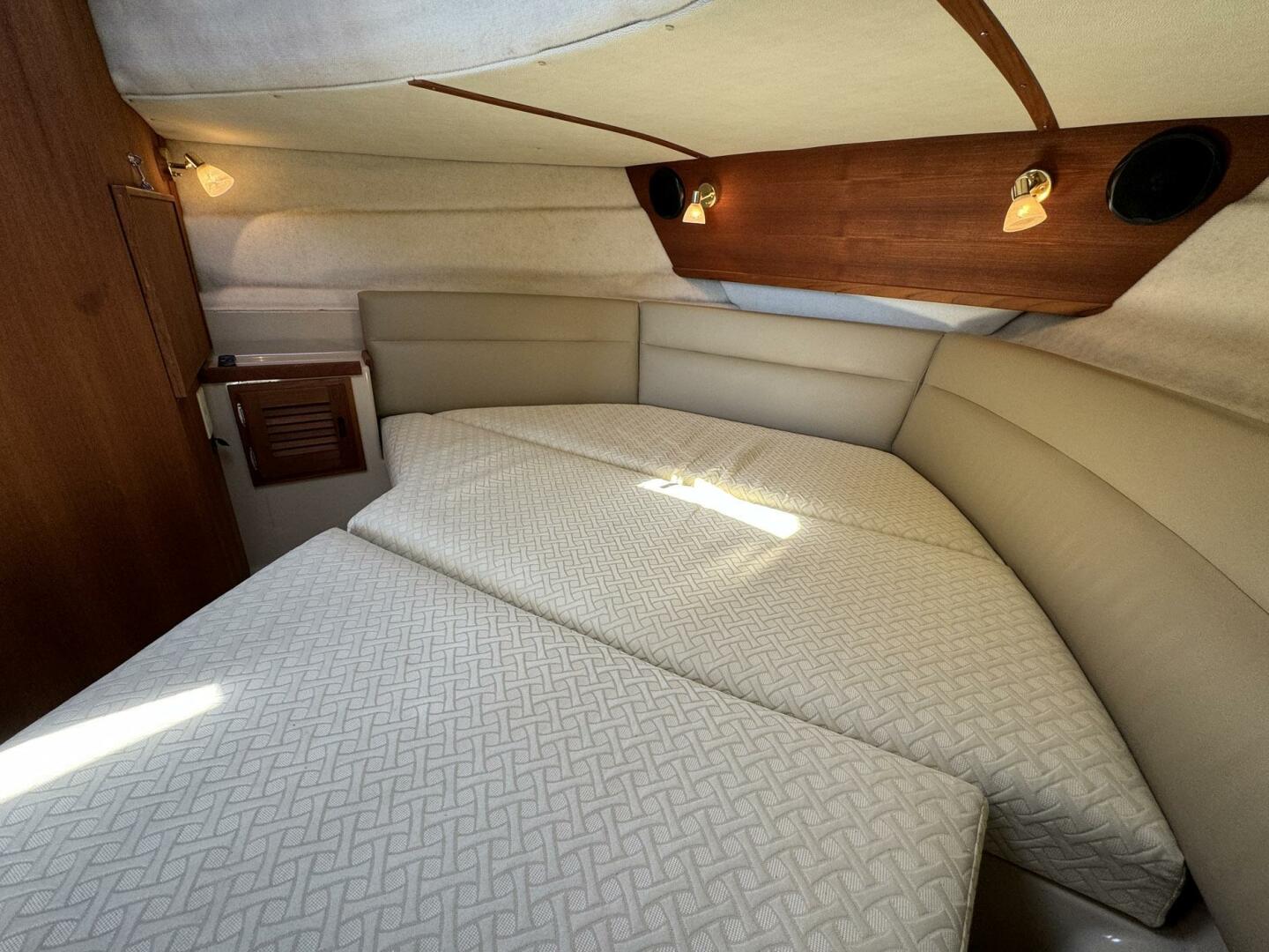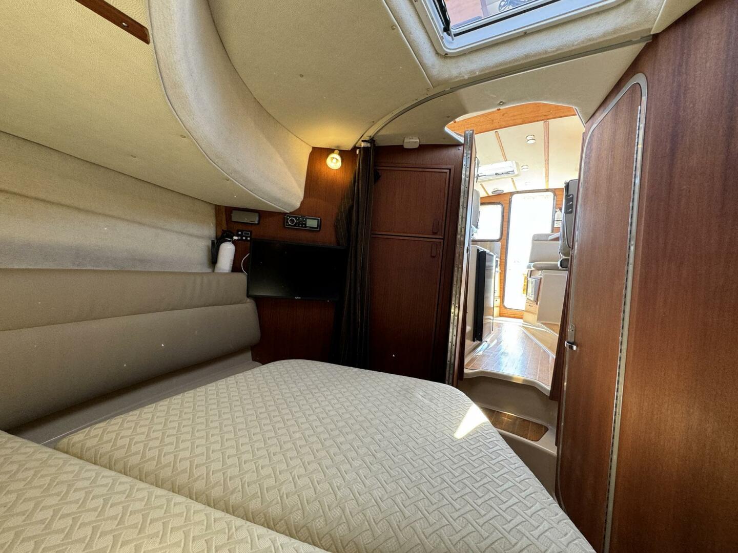 The forward stateroom features an island berth with separate head and shower, and a bi-fold privacy door separates the midship stateroom from the salon. Large salon windows and five opening skylight hatches provide excellent natural light and ventilation.