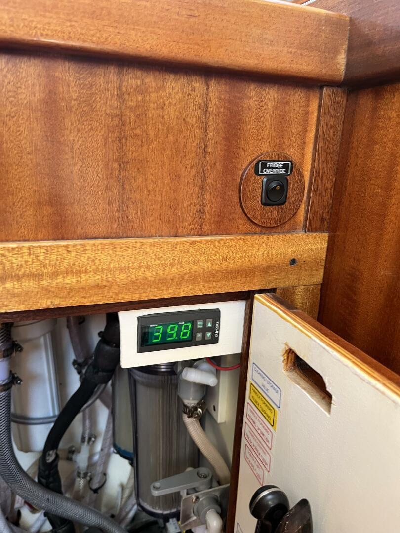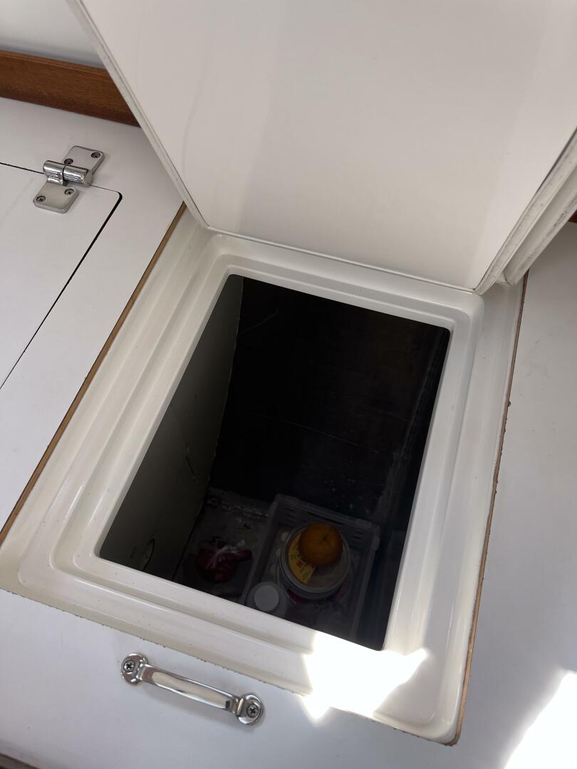 Separate top loading freezer and refrigerator fresh water cooled (via water tank in keel) with Dan Foss compressor