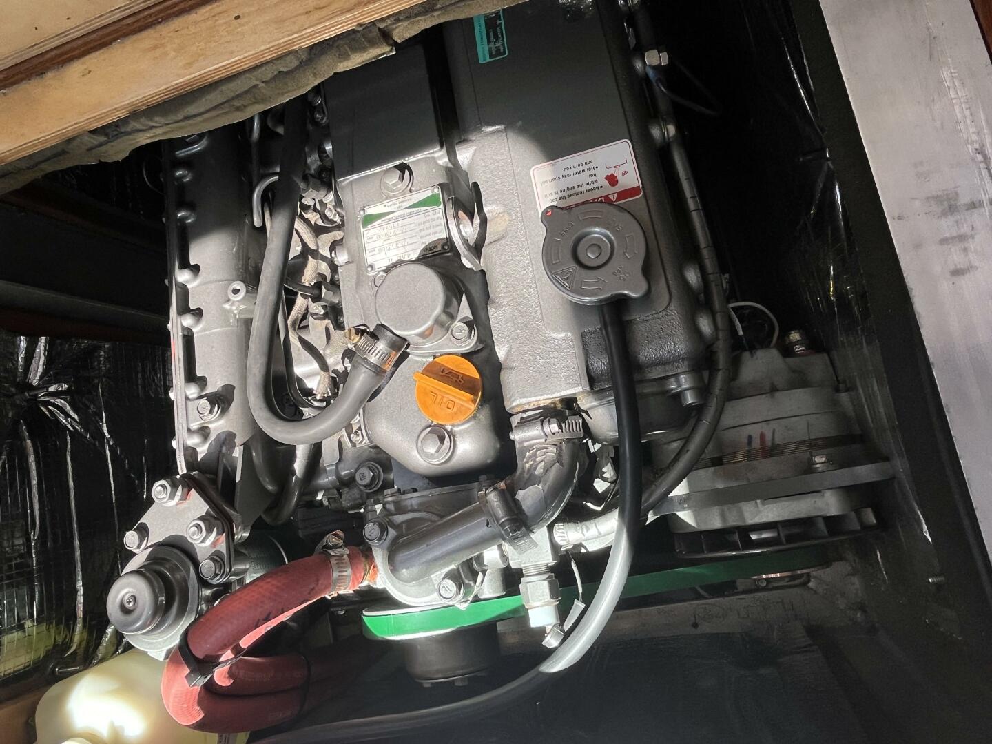 Back at the bottom of the companionway steps, directly forward is the main engine located inside removable insulated panels. Two large 10” high fore and aft removable stowage boxes are mounted over the engine and provide extensive galley counter space. (Temporary grid fiddles can be fitted on the counter when at sea). The engine may be completely exposed and serviced with easy removal of the four side panels and two top boxes.