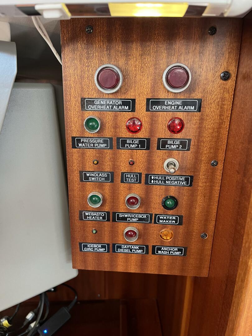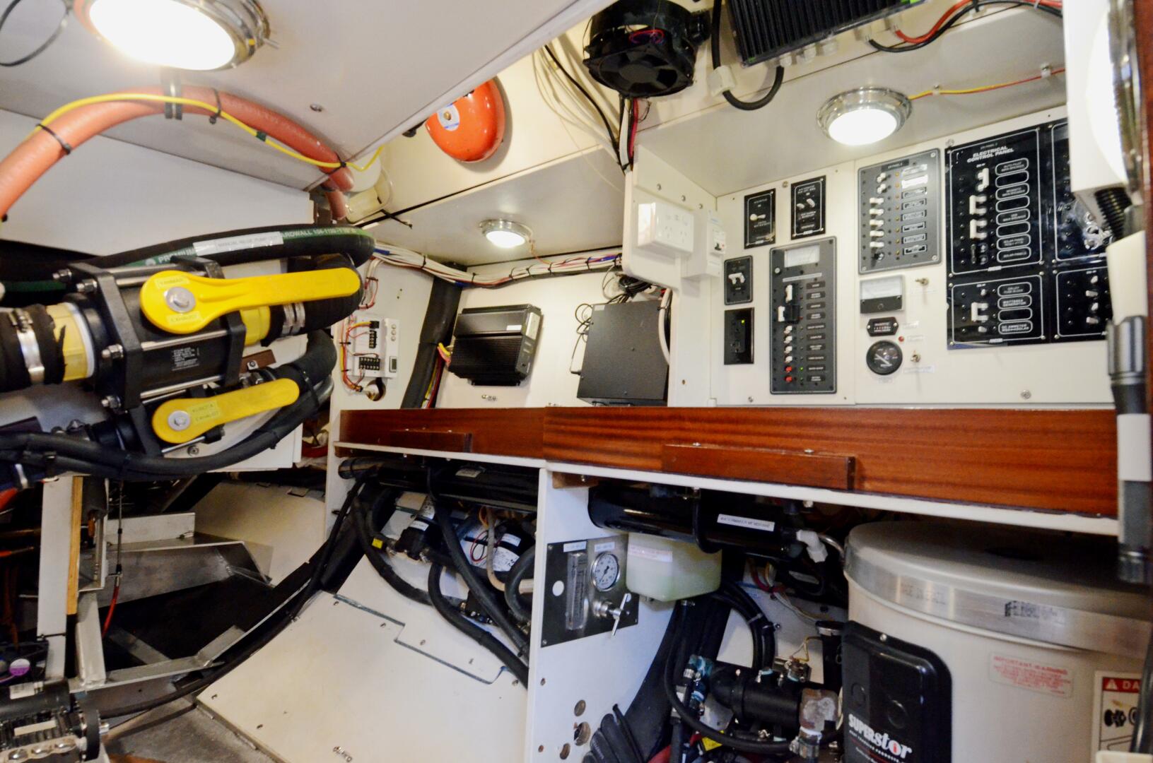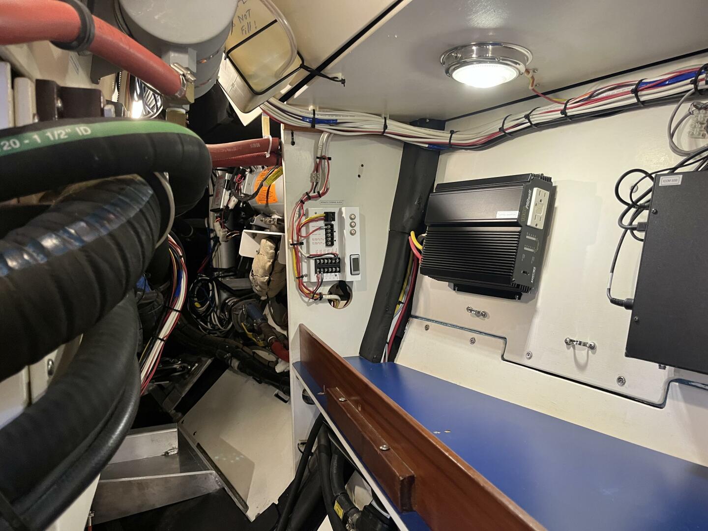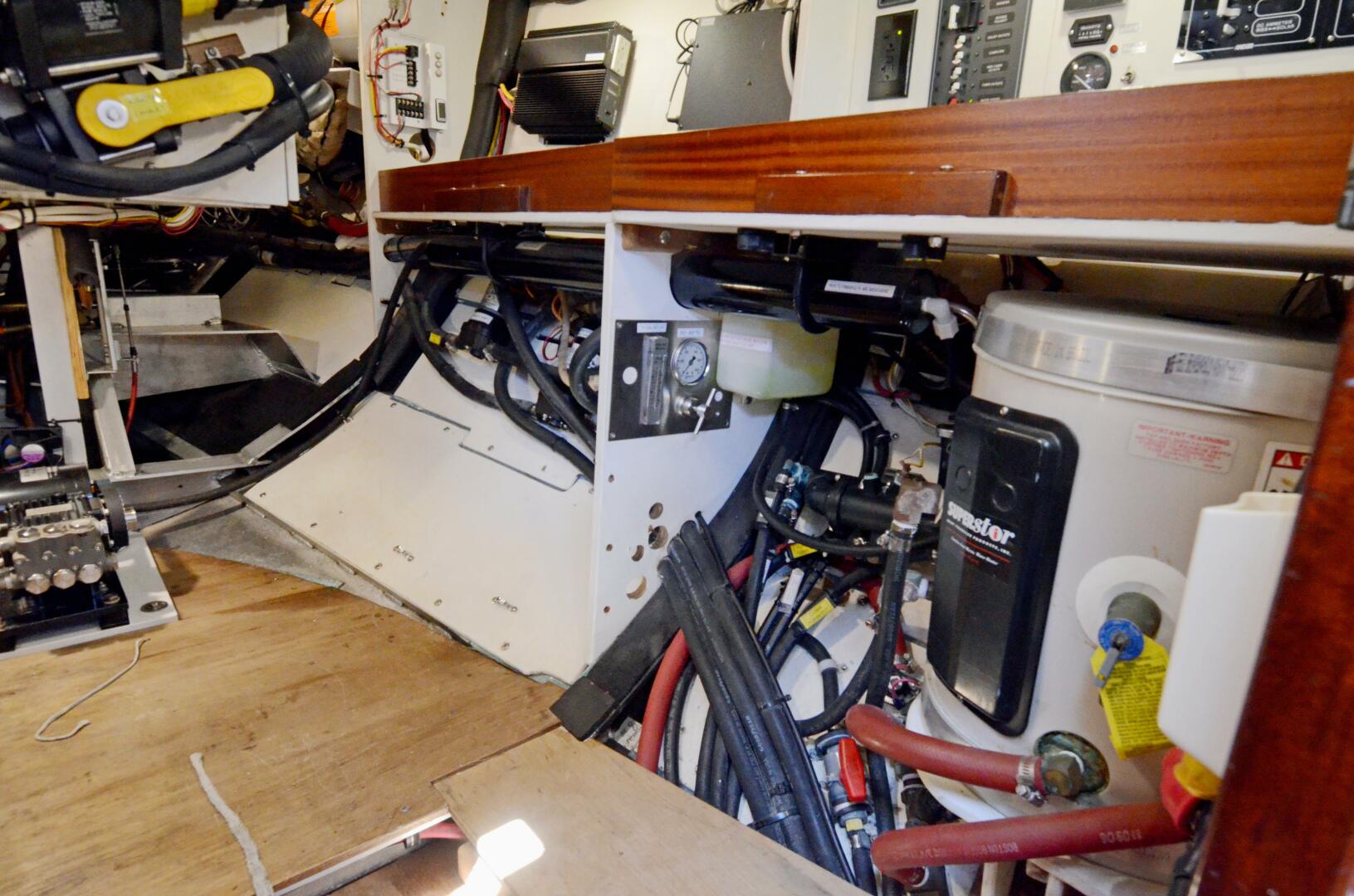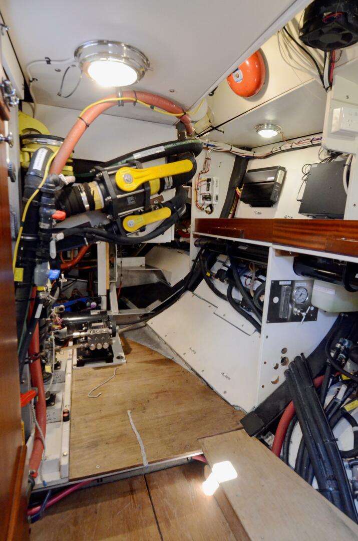 To the port aft (under the cockpit coaming) is virtually all of the mechanical equipment of the boat with easy access and a workbench 5 feet long and 21” deep that narrows going aft. This area includes DC diesel generator, Webasto heater, watermaker, diesel day tank, 2 hot water tanks, 3 bilge pumps, 1 shower/icebox pump, auto pilot pump, steering gear access, inverter, SSB radio antenna tuner, VAC wiring circuits and breakers, VDC pump solenoids, wiring, and breakers, and a portion of the N2K, and 0183 wiring connections.