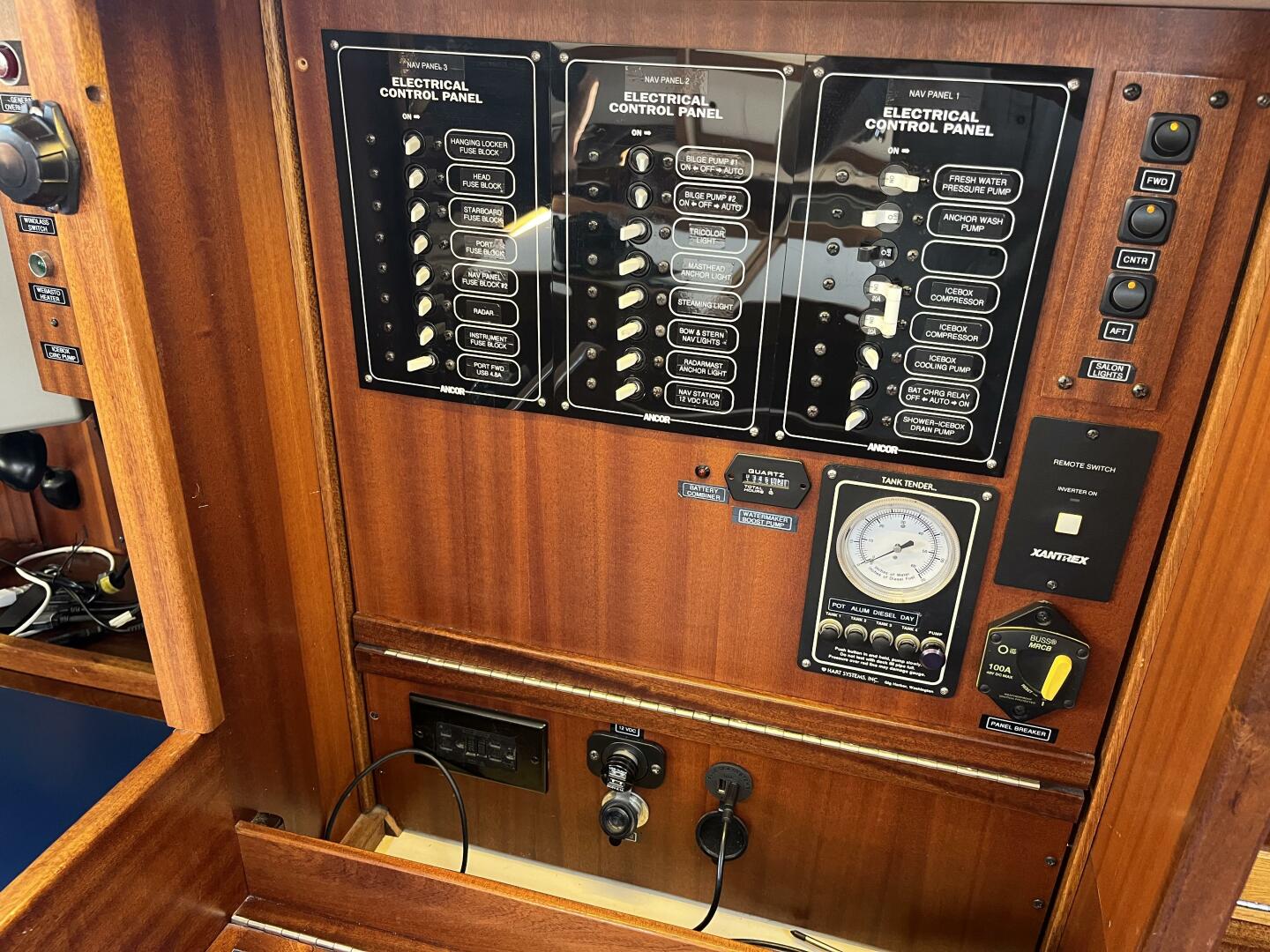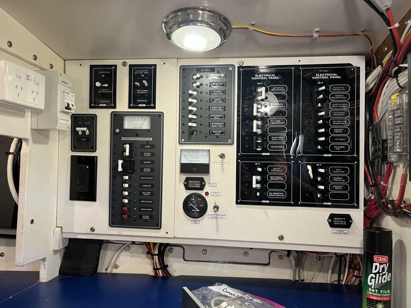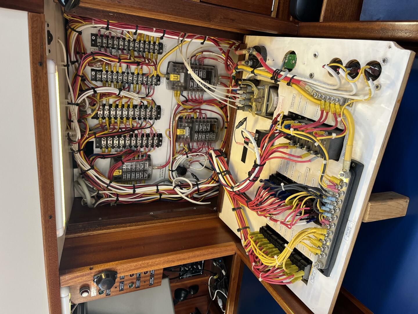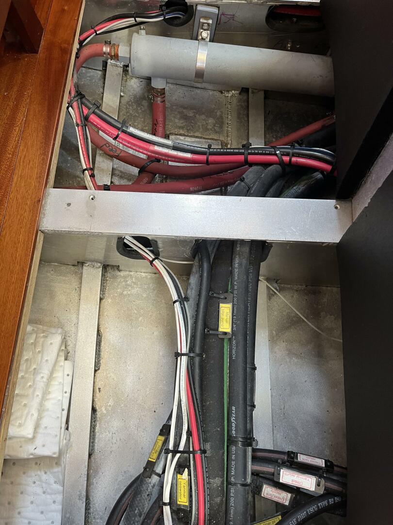 To the port aft (under the cockpit coaming) is virtually all of the mechanical equipment of the boat with easy access and a workbench 5 feet long and 21” deep that narrows going aft. This area includes DC diesel generator, Webasto heater, watermaker, diesel day tank, 2 hot water tanks, 3 bilge pumps, 1 shower/icebox pump, auto pilot pump, steering gear access, inverter, SSB radio antenna tuner, VAC wiring circuits and breakers, VDC pump solenoids, wiring, and breakers, and a portion of the N2K, and 0183 wiring connections.