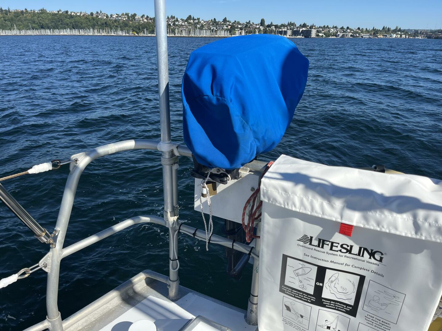 The aluminum hard dodger offers complete spray protection for crew seated forward in the cockpit. The arch at the aft edge of the dodger carries the mainsheet traveler with end-boom sheeting. The double ended main sheet and traveler control lines fall in the spray protection zone.