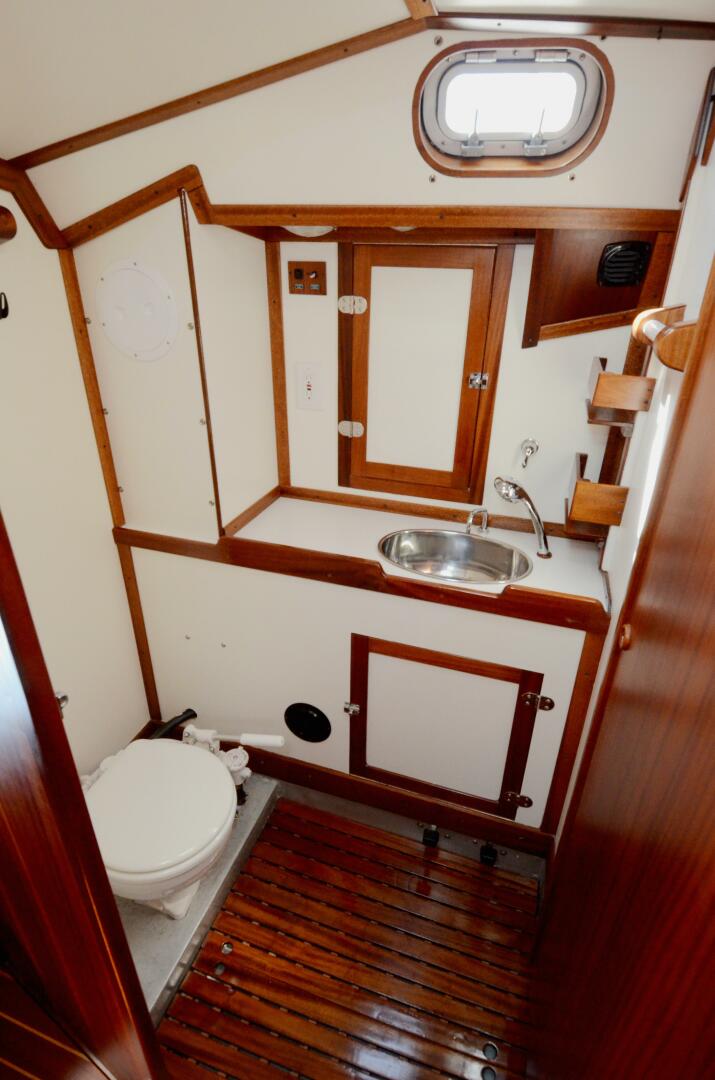 The toilet in the head is mounted fore and aft and with secure hand holds for easy use in a seaway.