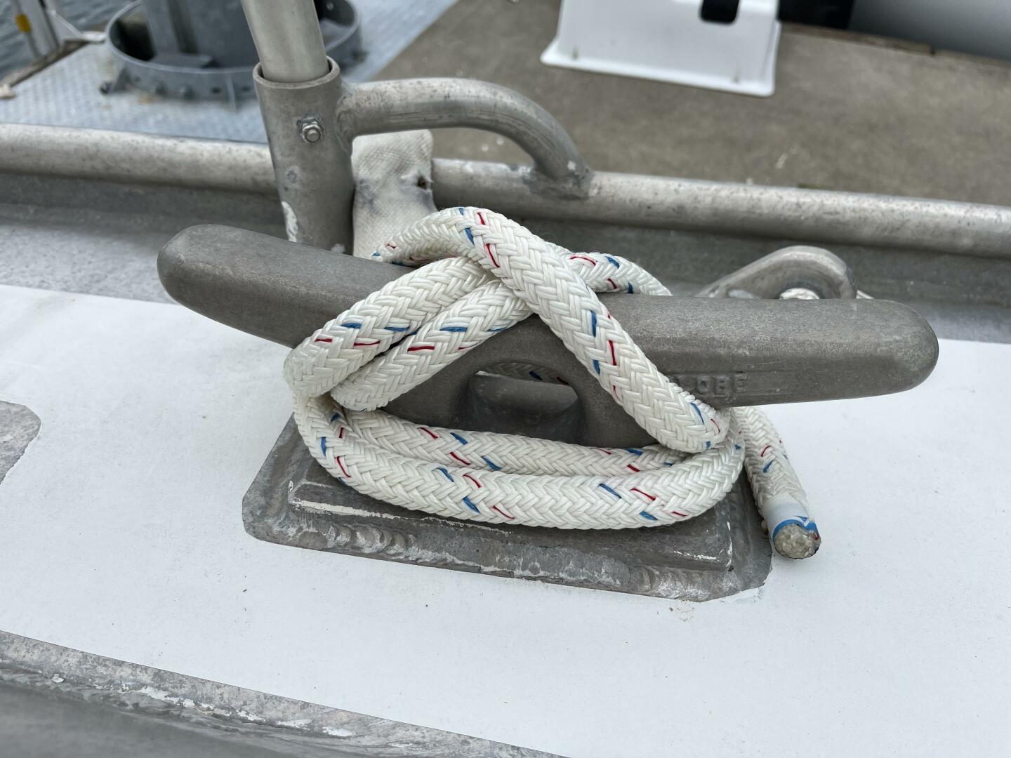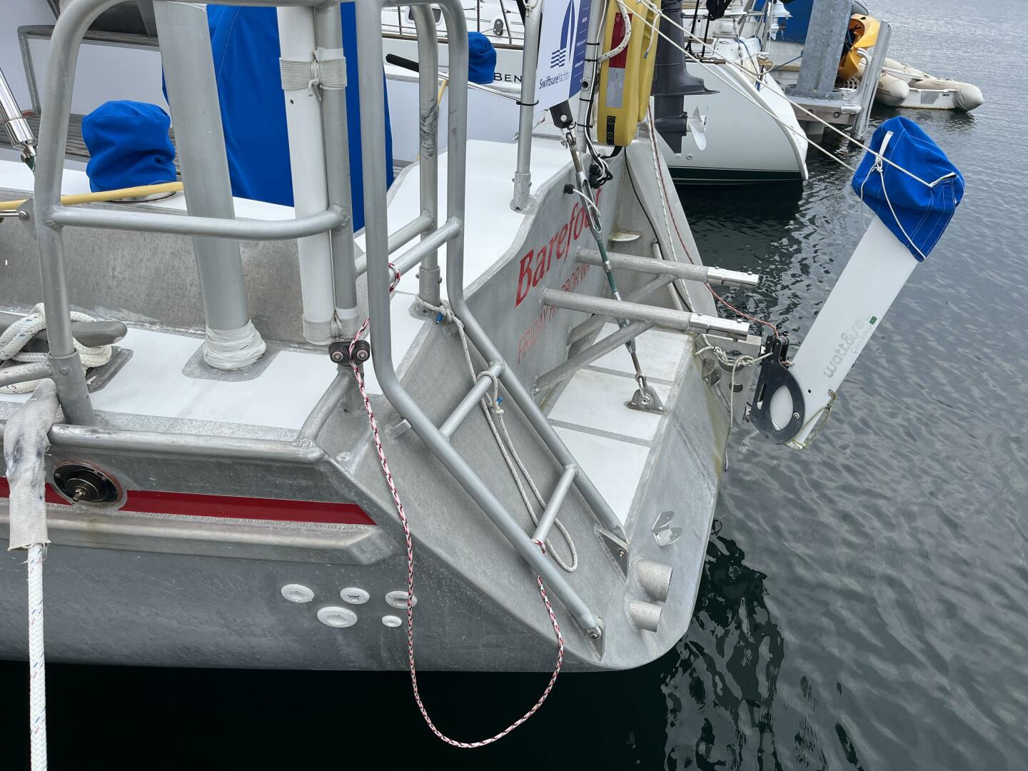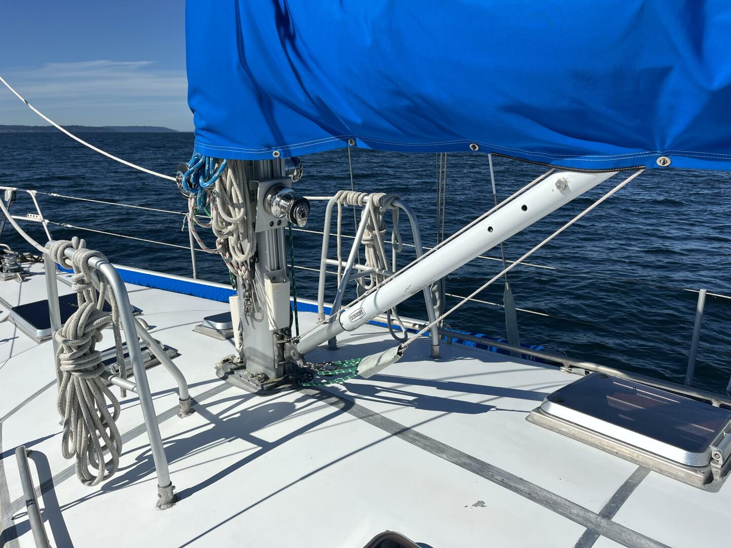 The sealed aluminum rudder is semi-balanced with a partial skeg. The rudder post is 4” diameter solid aluminum post with Vesconite bearings and separate tiller arms for the steering cable connections and the auto pilot hydraulic ram.