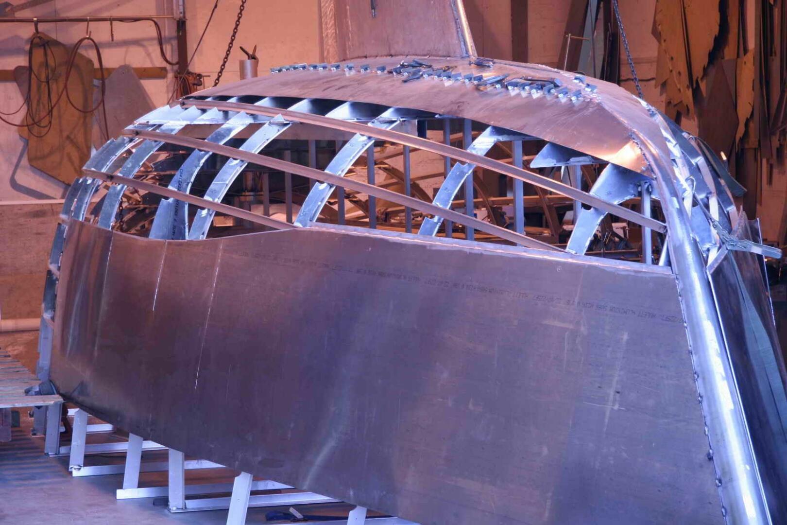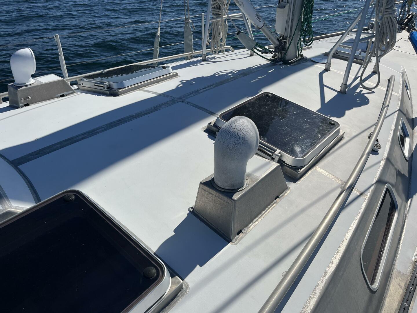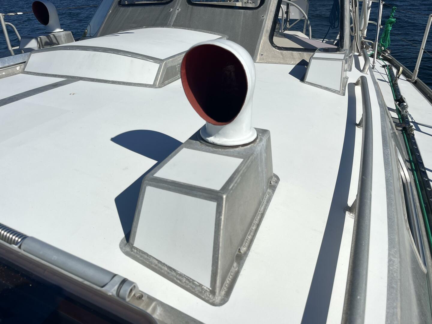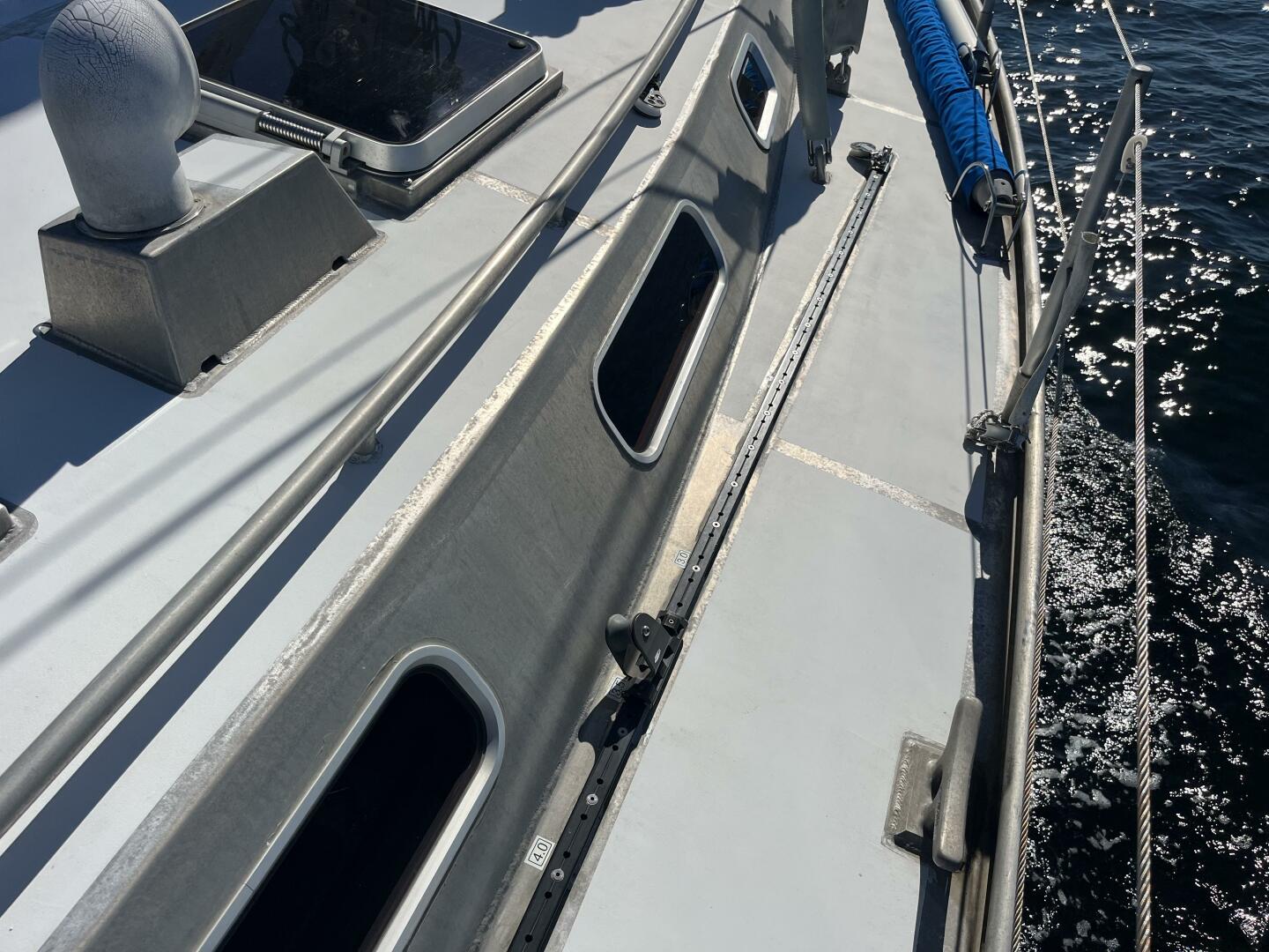The unpainted aluminum hull is formed with compound curves; her slippery design is evident when she motors sedately at 6 knots with virtually no visible wake. The aluminum plate alloy is 5083/5086 and extruded frames and stringers are 6061 alloy. All frames and stringers are “L” shaped, rather than flat bar. The aluminum deck is continuously welded to the hull providing a watertight structural envelope. All chain plates, cleats, chocks, stanchion bases, dorade boxes, granny bars, handrails, mast step, and genoa tracks are welded in place, immoveable, and waterproof. The six deck hatches are mounted slightly elevated to reduce exposure to wave wash at sea.