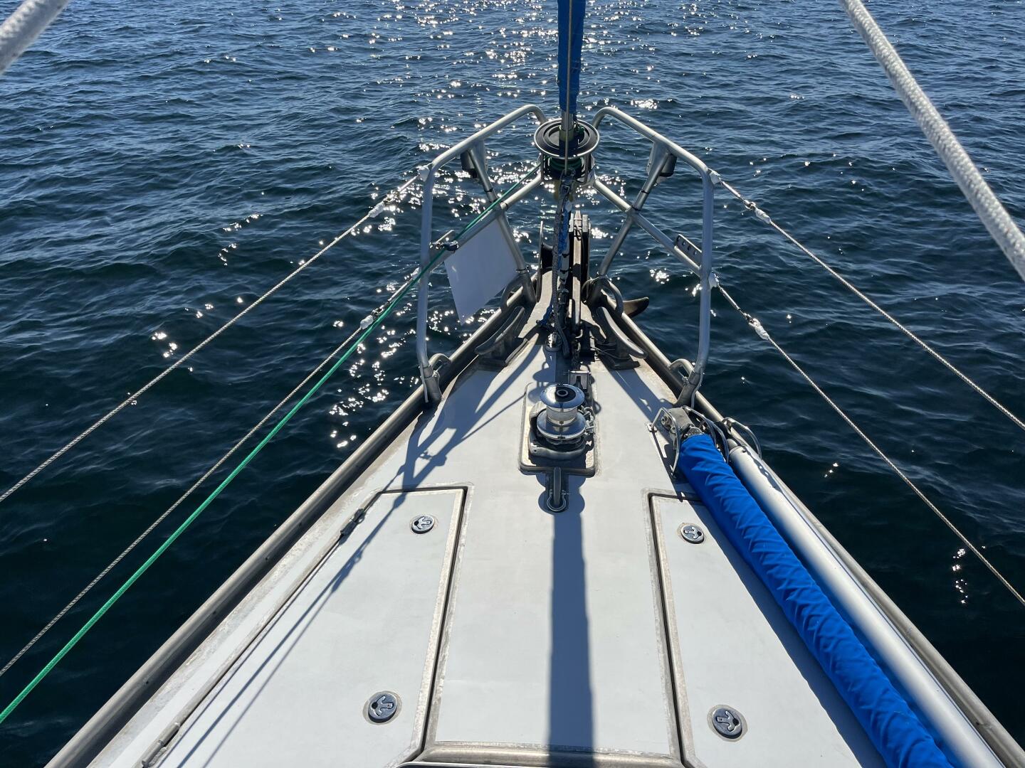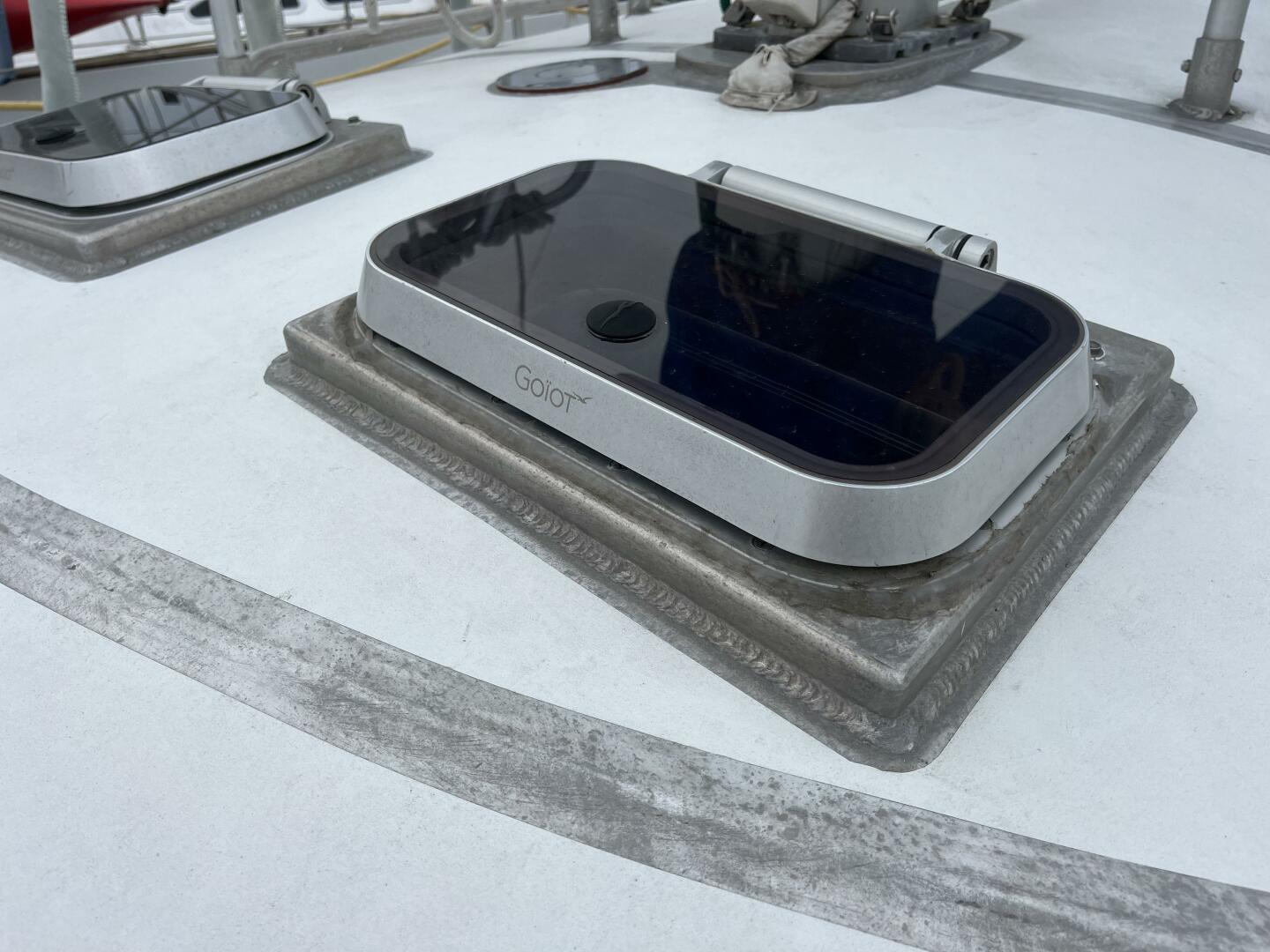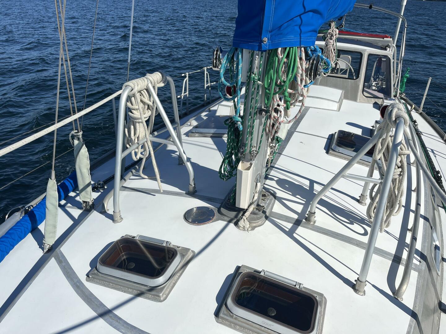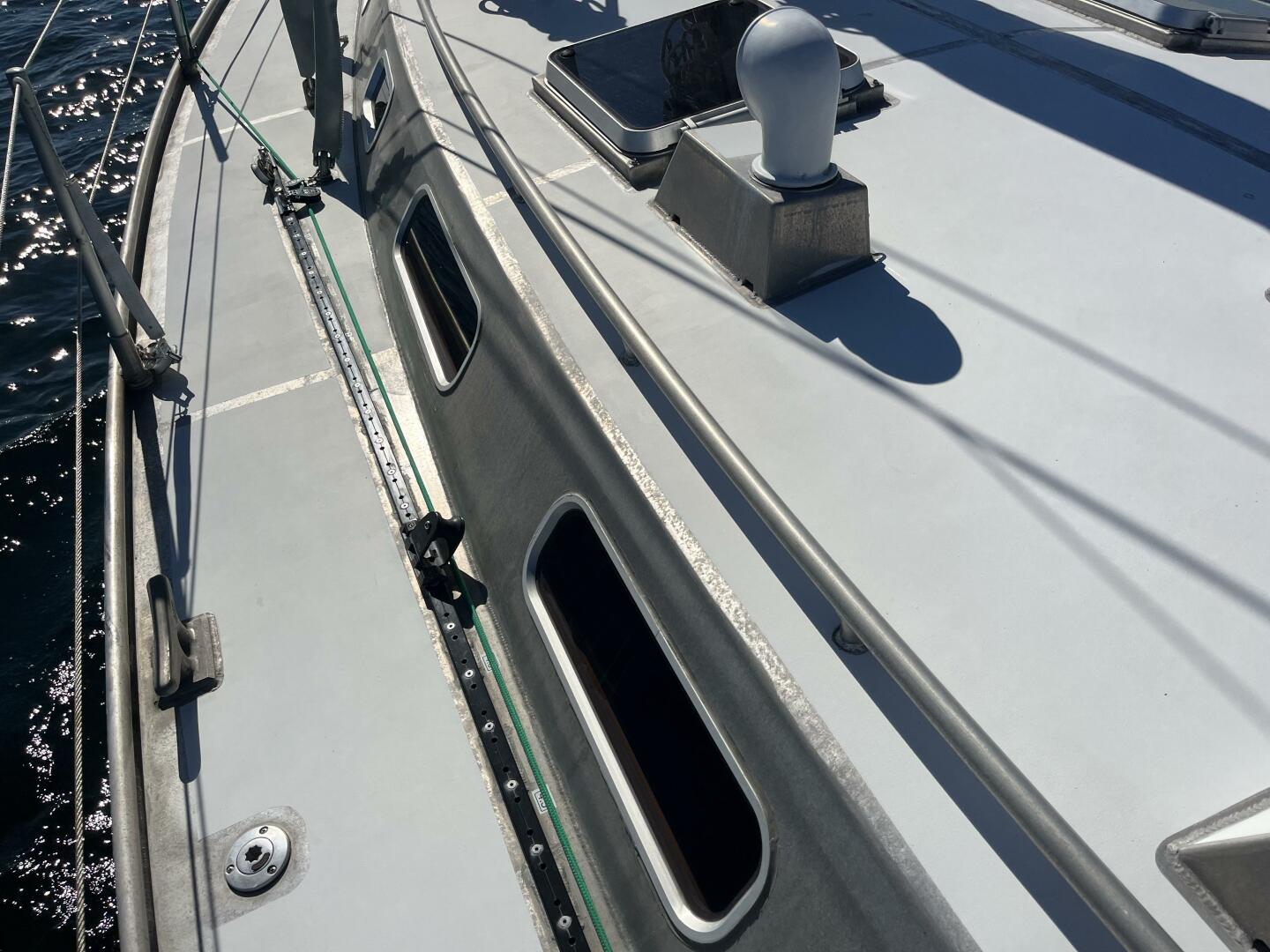 The unpainted aluminum hull is formed with compound curves; her slippery design is evident when she motors sedately at 6 knots with virtually no visible wake. The aluminum plate alloy is 5083/5086 and extruded frames and stringers are 6061 alloy. All frames and stringers are “L” shaped, rather than flat bar. The aluminum deck is continuously welded to the hull providing a watertight structural envelope. All chain plates, cleats, chocks, stanchion bases, dorade boxes, granny bars, handrails, mast step, and genoa tracks are welded in place, immoveable, and waterproof. The six deck hatches are mounted slightly elevated to reduce exposure to wave wash at sea.