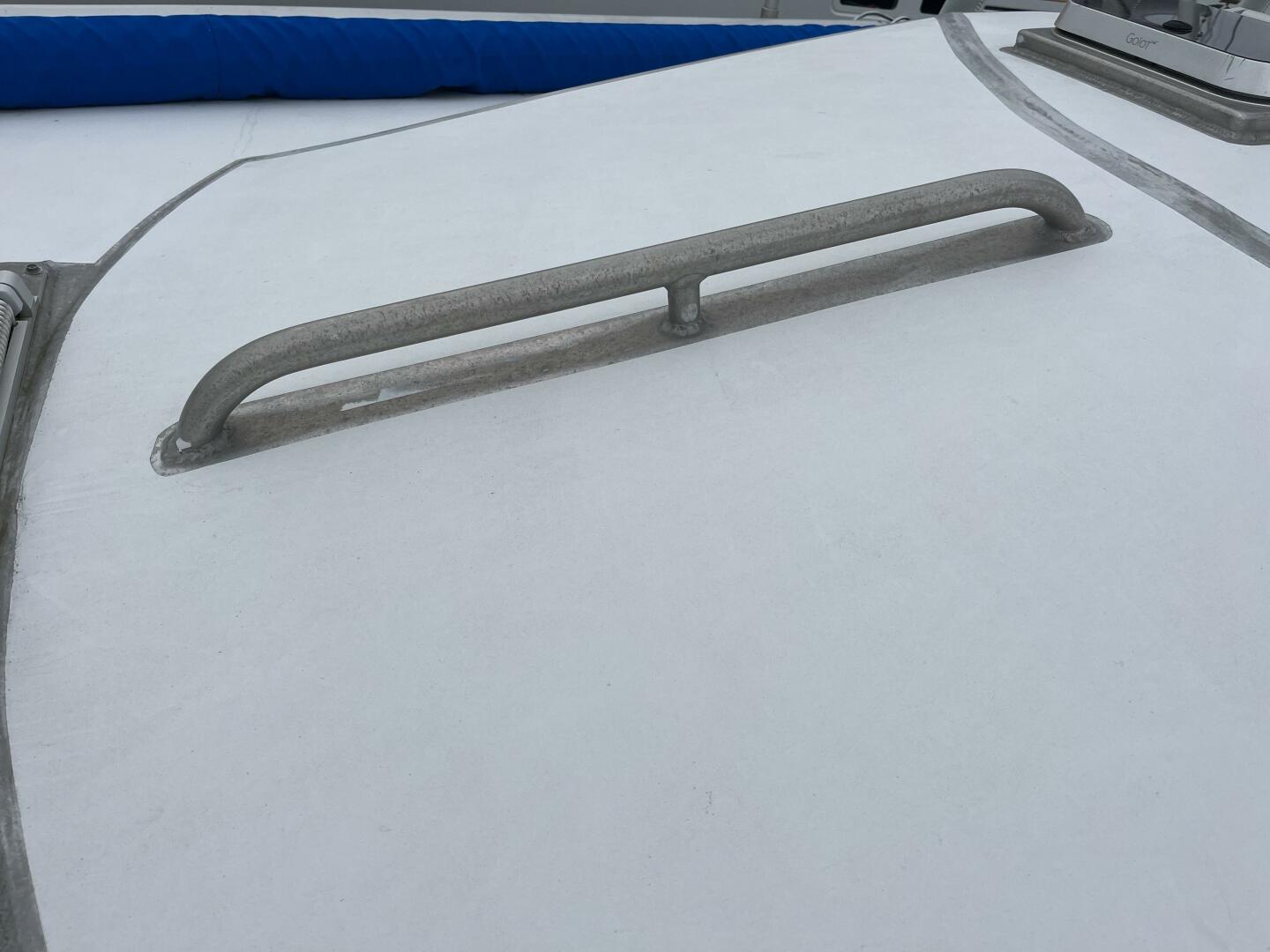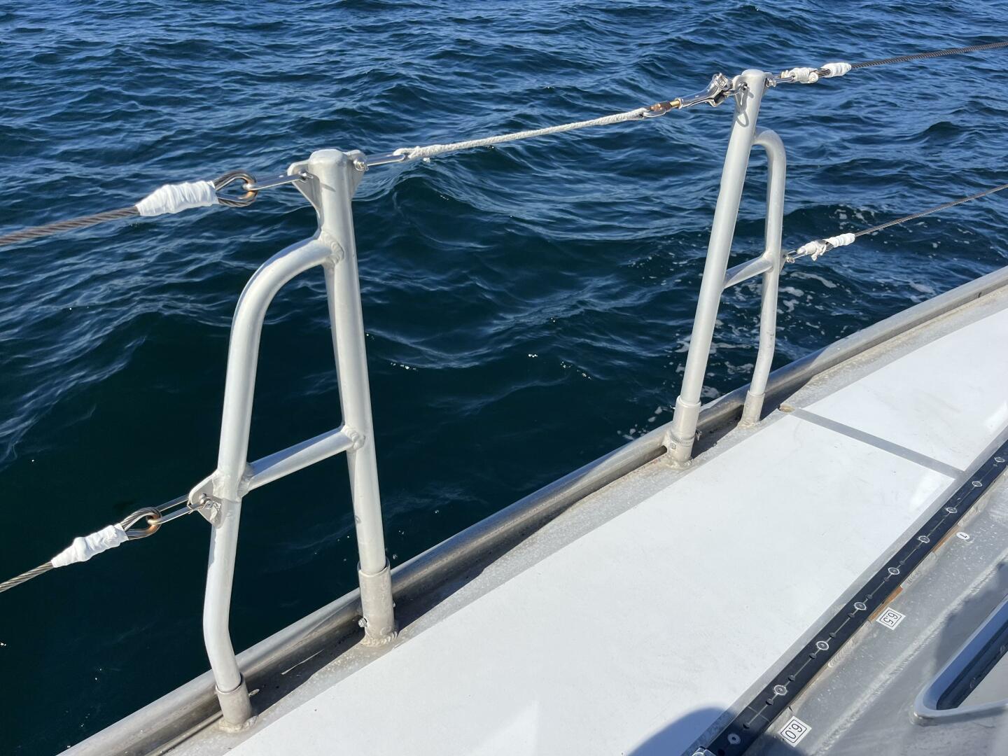 Security and Safety: The granny bars port and starboard at the mast feature fore, aft, and inboard legs for support when working the mast in a pitching sea.