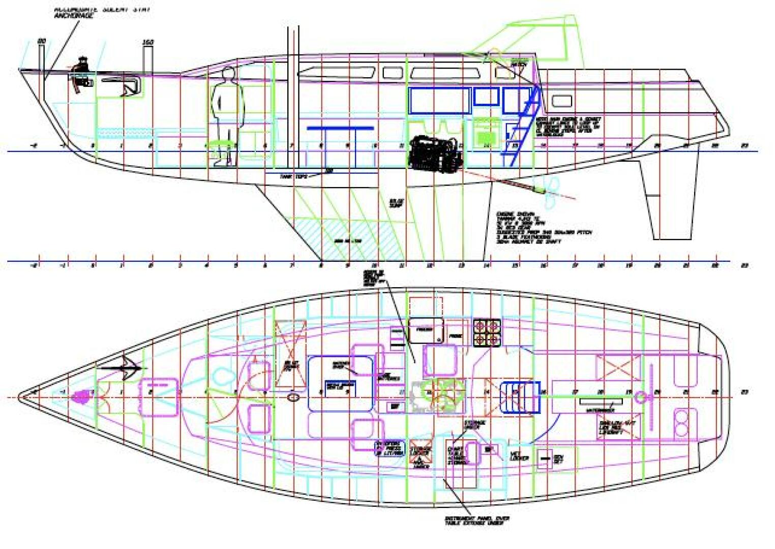 BAREFOOT’s underbody is configured with a long fin keel (10 foot length at bottom). The keel is packed with lead ballast and also contains a 90 gallon diesel tank and a 99 gallon fresh water tank. The keel tankage adds stiffness to the boat and leaves more stowage area in the cabin.