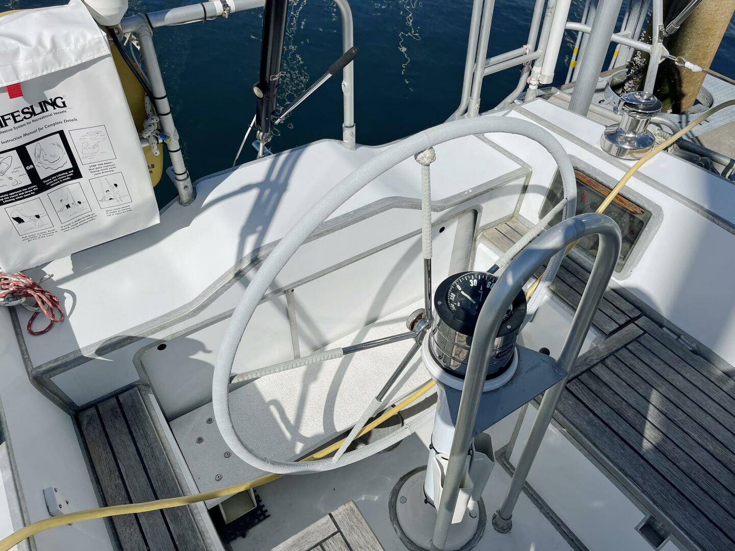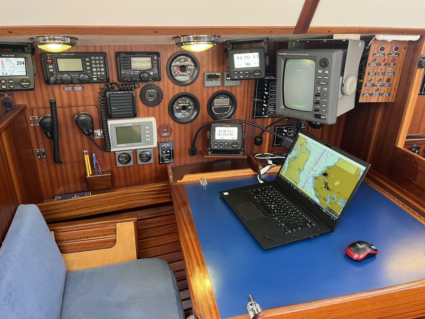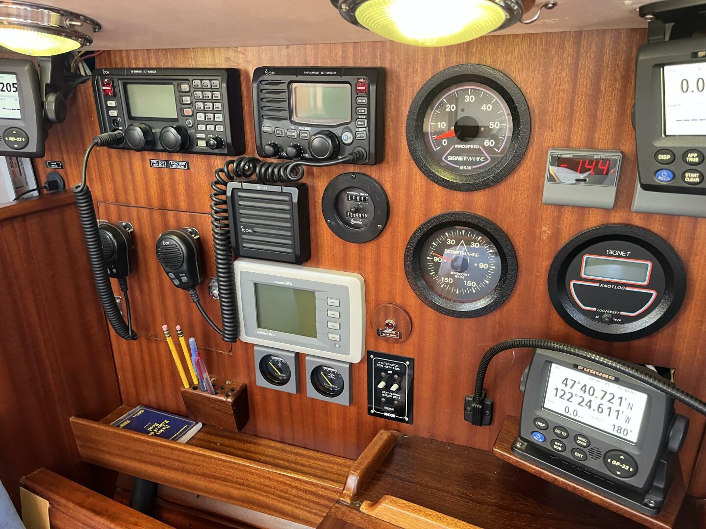 Edson cable steering (42” leather covered helm). Powerful and precise hydraulic auto pilot with independent 1/4HP WH motor (reversible, variable speed), hydraulic pump that drives Kobelt hydraulic ram. Simrad NAC3 electronics, AP44 control head and OP-12 cockpit remote control auto pilot from cockpit or navigation station below. Directional steering input from Simrad fluxgate compass, or true/apparent wind via radar mast mounted LCJ Capteurs wind sensor, or Airmar wind sensor.