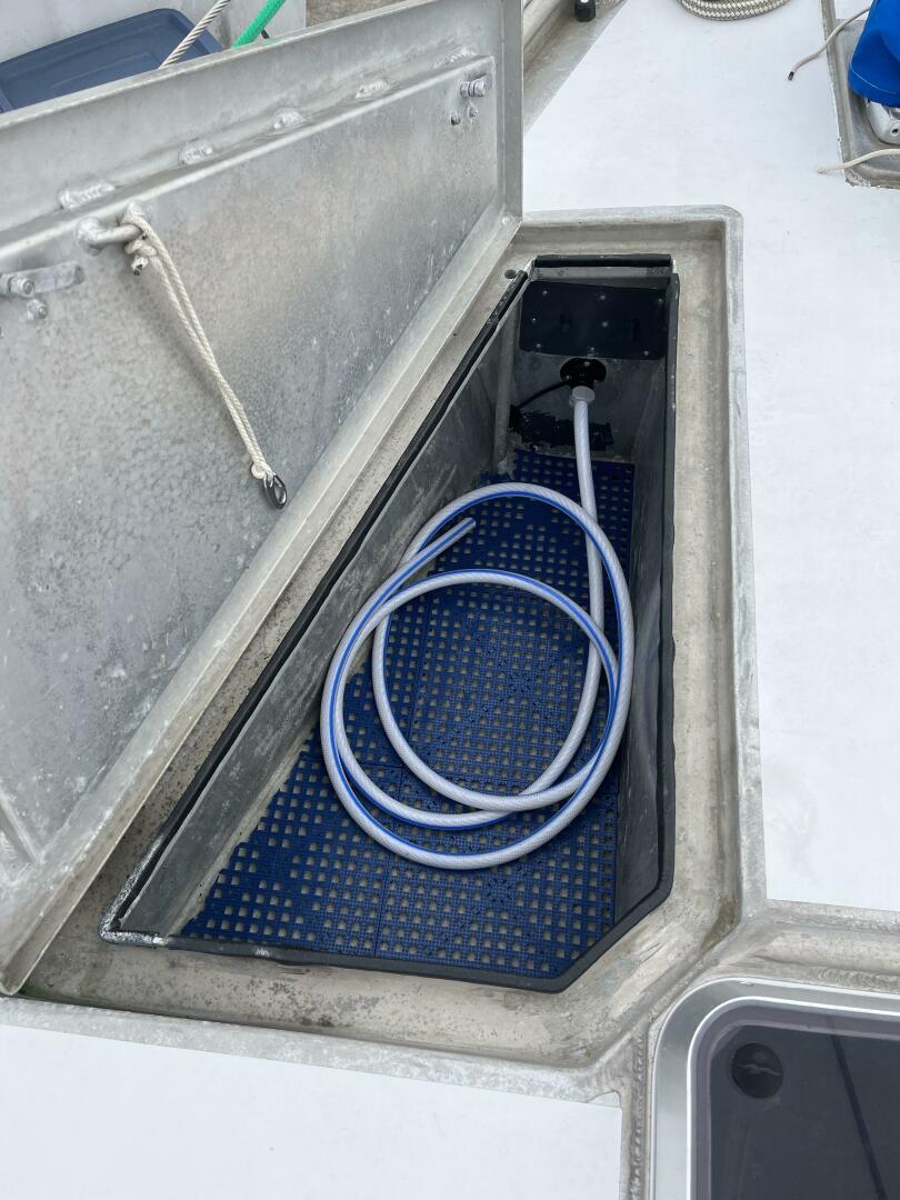 The two anchor locker hatches at the bow with spare anchors, chain, and rode are isolated from the boat interior. The two cockpit lockers are also isolated from the boat interior. Port cockpit locker can stow a valise life raft.