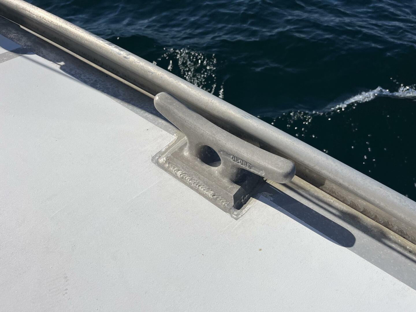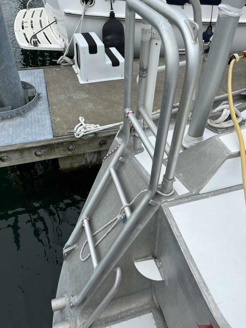 The interior overhead handrails are aluminum pipe secured with fasteners tapped into the boats aluminum frames. The numerous other interior handrails are also aluminum pipe and are through bolted to bulkheads.