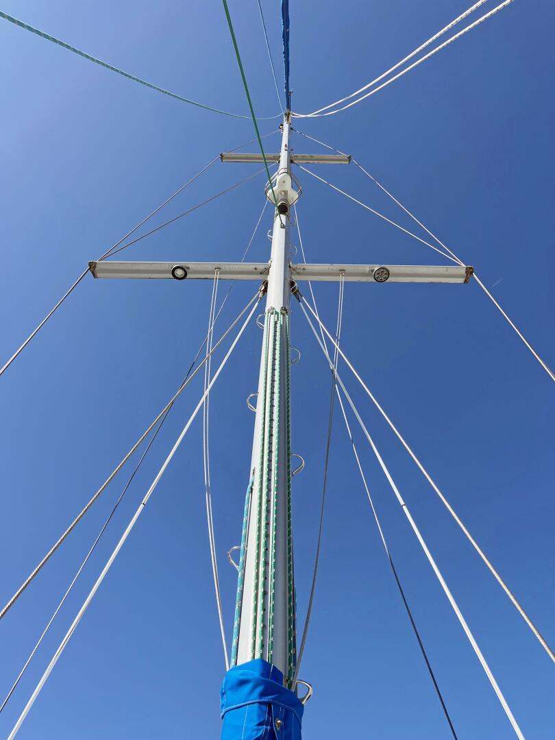 Deck stepped mast prevents seawater below and prevents corrosion at mast butt. Also, enables mast removal and stepping in remote locations lacking cranes tall enough to clear mast butt from deck. Shrouds and stays 3/8” wire with Hayn reusable cone fittings upper and lower