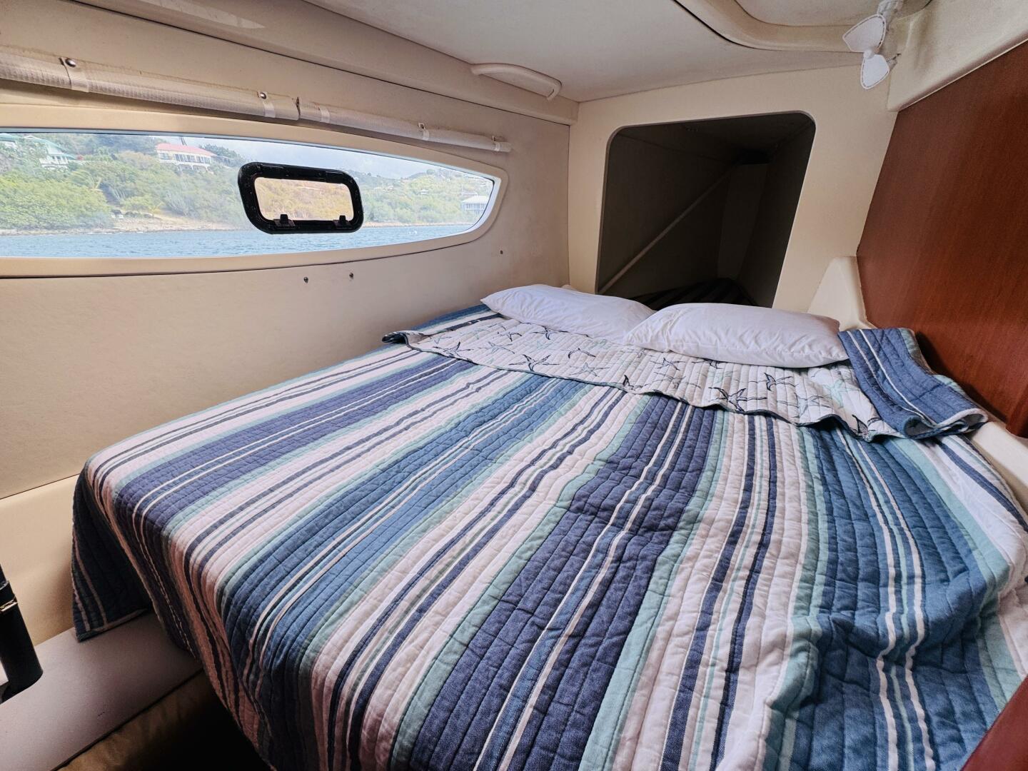 Below decks Buying Time offers four private cabins, each with its own ensuite head and separate shower, designed for comfort, privacy, and ease of use. The two aft hull cabins have queen‑sized berths with walk‑around access, good storage, and ventilation through overhead hatches and ports. The forward cabins also feature generous berths with private heads and ventilation, making them comfortable for family, guests, or extended cruising. Throughout the interior, storage space is well thought out, ventilation and natural light are abundant, and the overall feel is bright, open, and live‑aboard friendly.