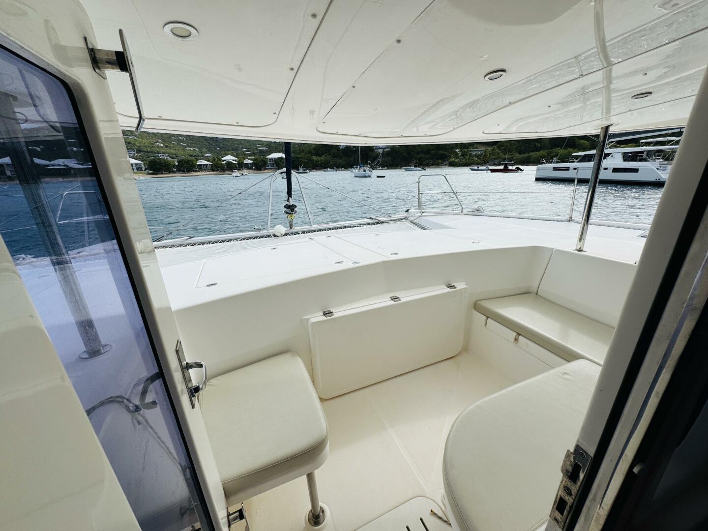 Boarding Buying Time from the stern, you enter a covered aft cockpit that comfortably seats eight around a dining table, creating a relaxed outdoor living area perfect for meals, socials, or watching the sunset. Just inside the sliding glass doors is a bright, open salon with panoramic windows and a galley‑up layout that flows into the living space, making it easy to socialize while preparing meals. Ahead of the salon, a unique covered forward cockpit provides another sheltered lounging space, excellent ventilation, and a direct connection to the outdoor life on board — a feature that sets the Leopard 44 apart and enhances comfort underway and at anchor.