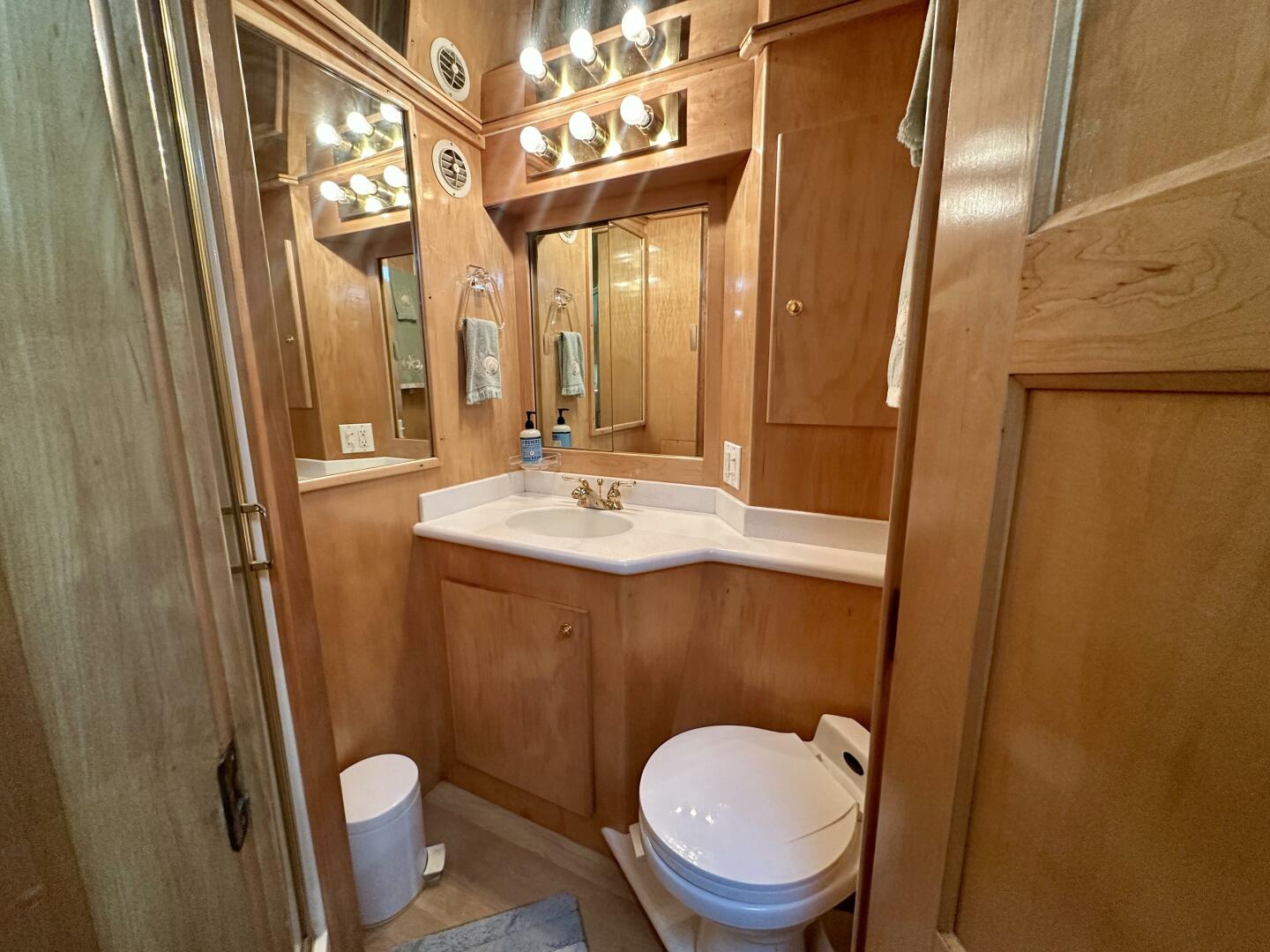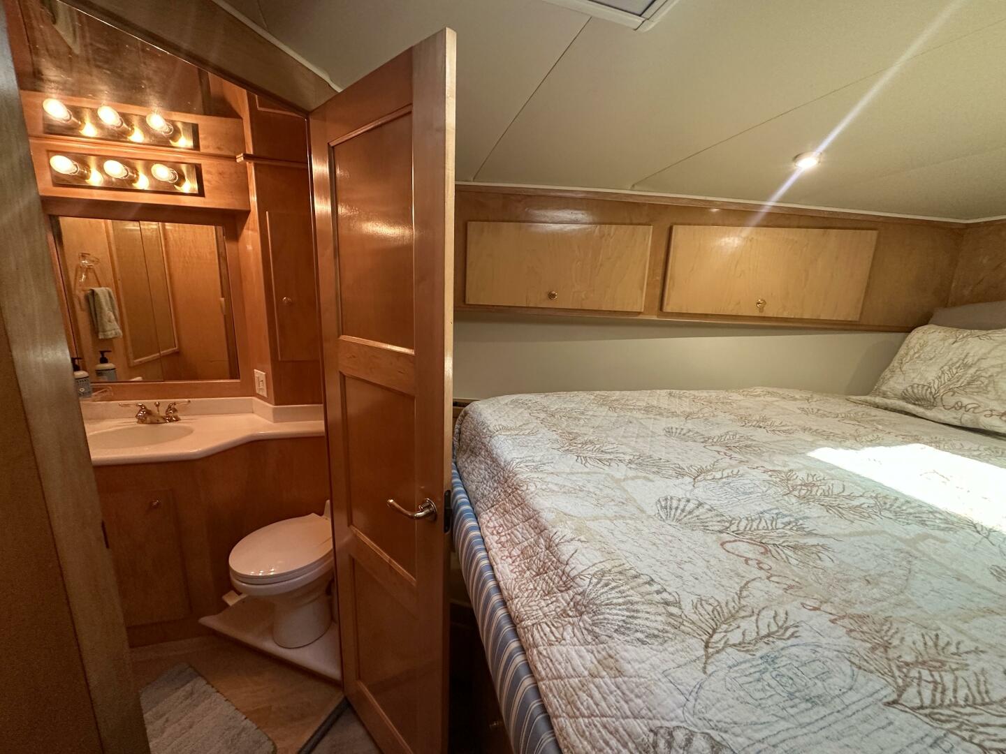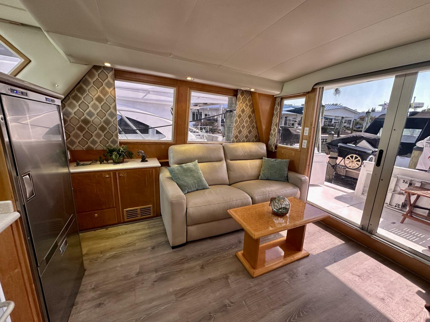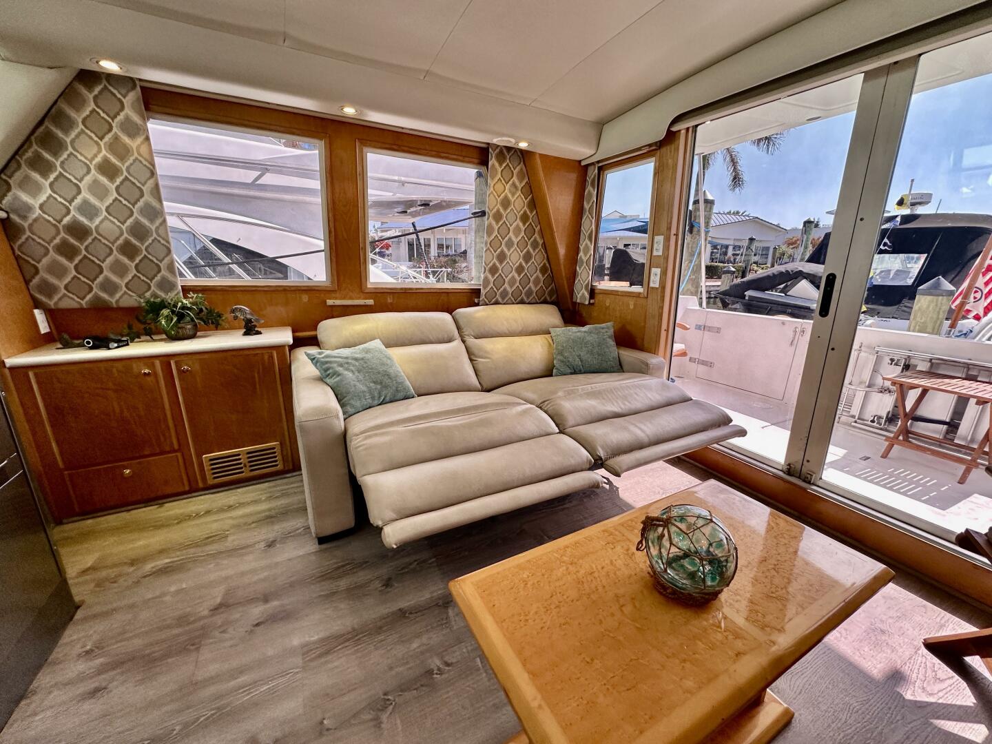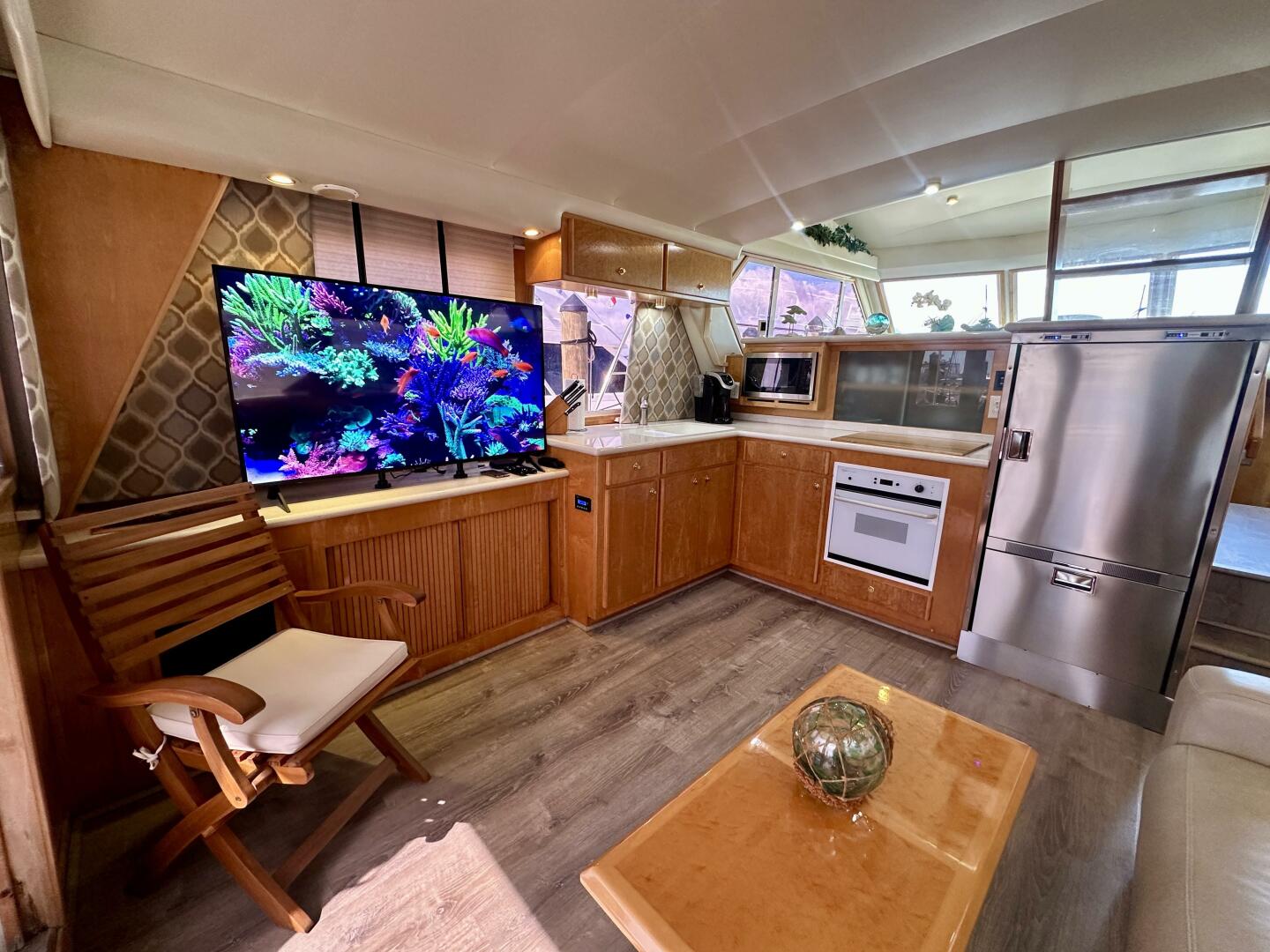 The yacht features a well-appointed two-stateroom layout with ensuite heads, a spacious salon with large windows that provide abundant natural light, and a fully equipped galley designed for comfort while cruising. The pilothouse helm offers excellent sightlines and easy access to the flybridge, making docking and navigation straightforward.