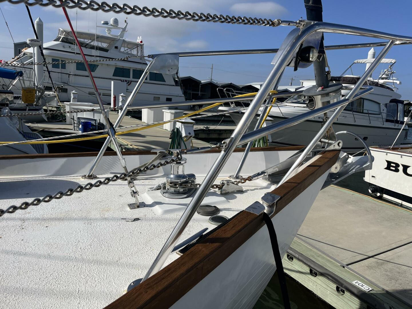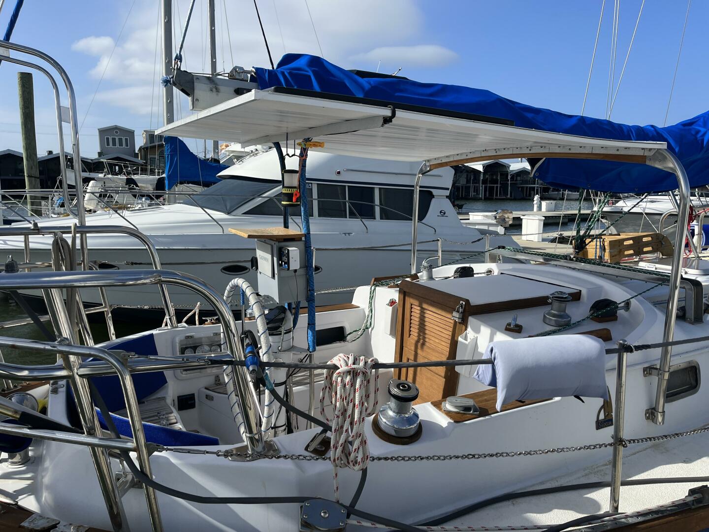 - Teak: Cockpit sole, cockpit seats, rub rail, cap rail, and stern seat