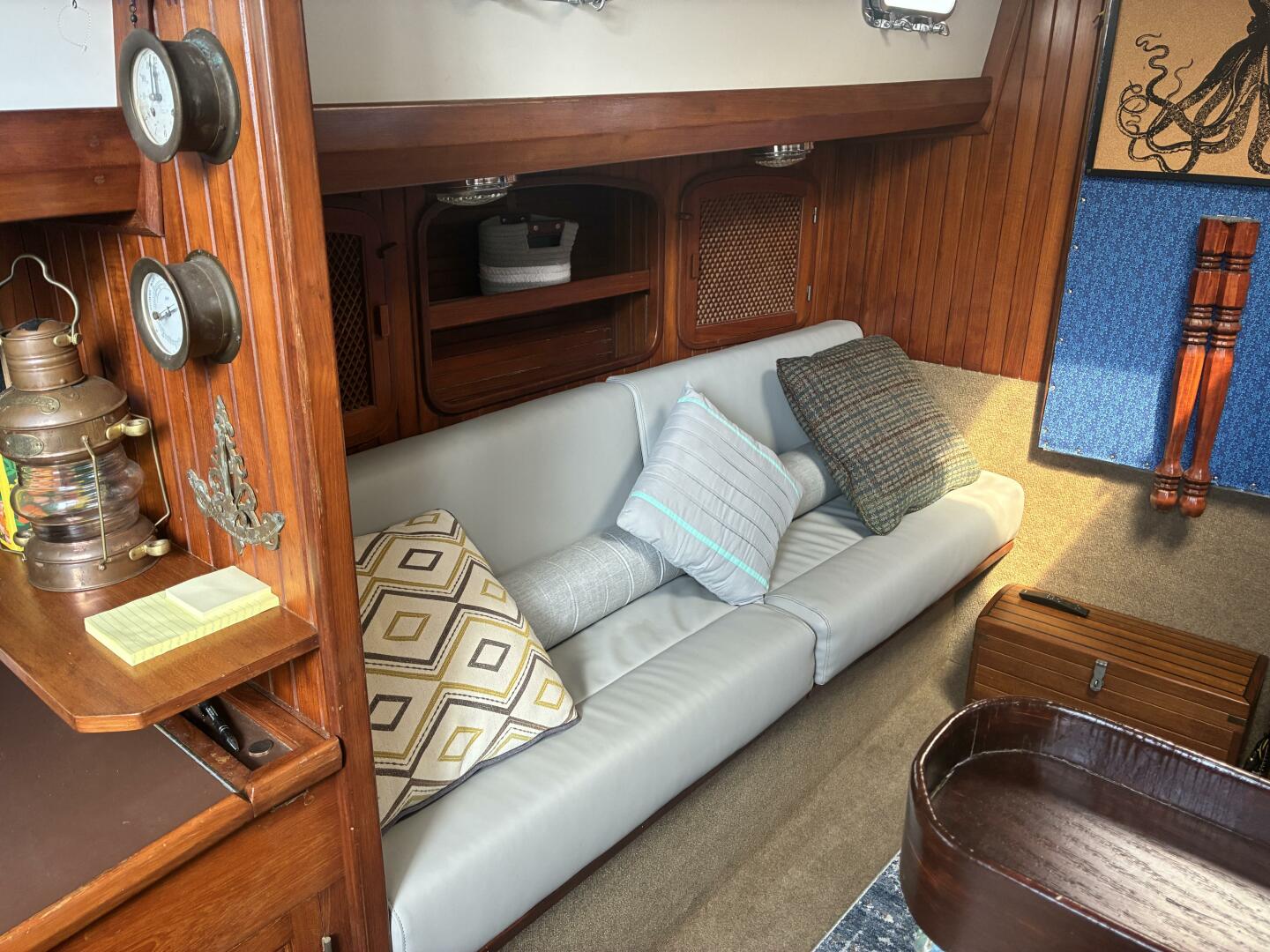Although designed with serious passagemaking in mind, the Slocum 37 was never intended to be a purely utilitarian offshore machine. Instead, she balances bluewater capability with cruising comfort, making her equally suitable for relaxed coastal sailing or a quiet weekend cruise. The sail plan incorporates modern sheet winches, slab reefing, and a boomed staysail, allowing the vessel to be handled confidently by a short-handed crew. All primary sail controls and sheet winches are arranged for efficient operation from the cockpit.