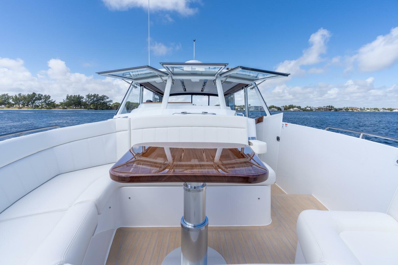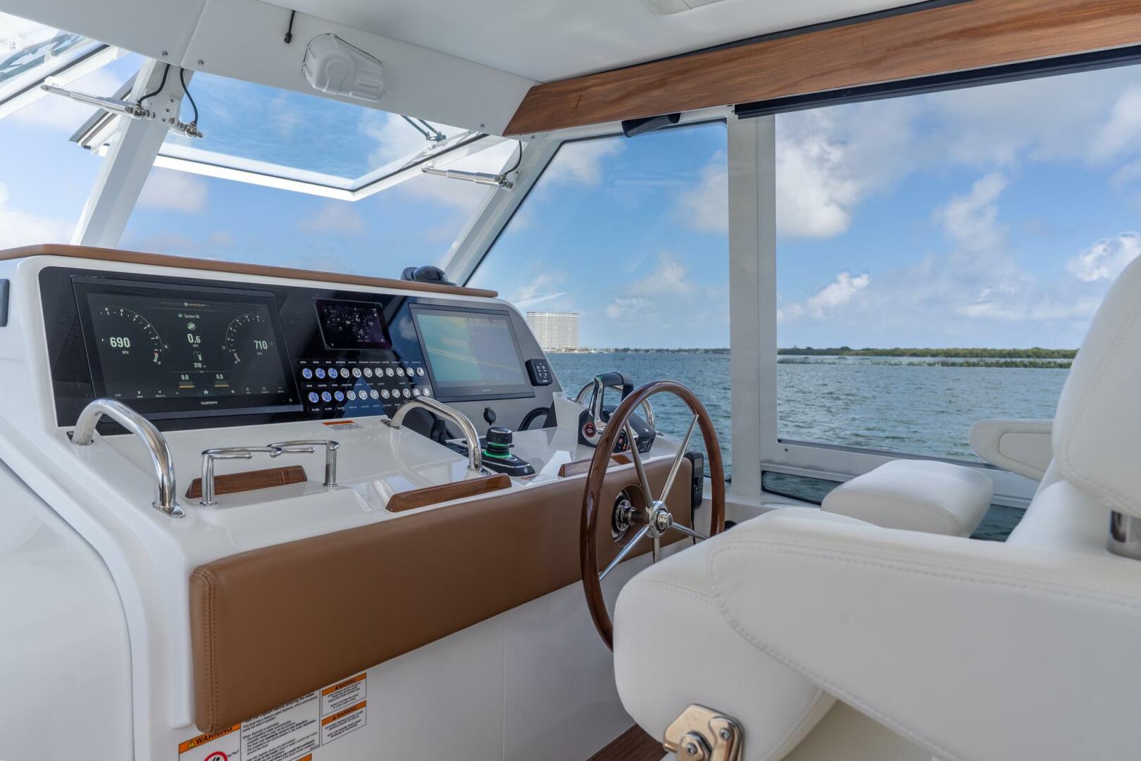 The bright pilothouse features an integrated glass system, opening forward windows, and sliding side windows, creating a comfortable indoor-outdoor feel. Premium finishes include high-gloss teak accents, Ultraleather seating, and synthetic teak decking, while the versatile cockpit and bow seating areas provide ideal spaces for entertaining.