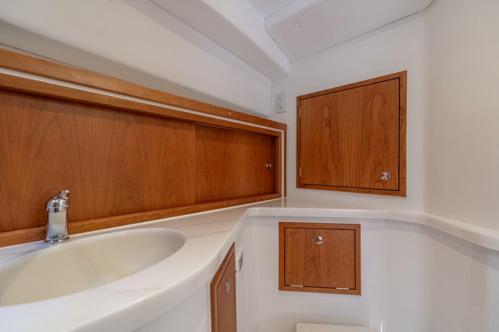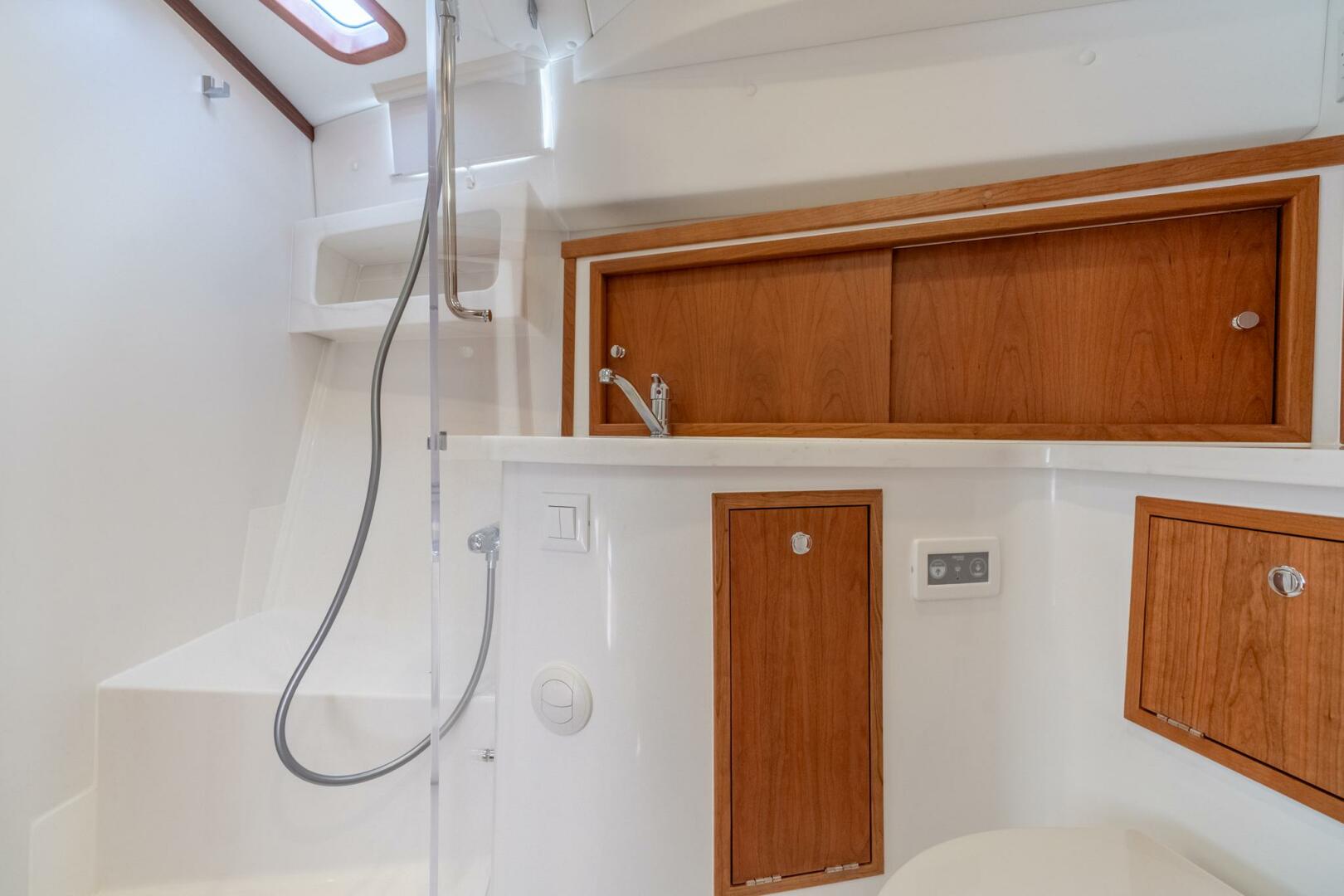 - Enclosed head to starboard with separate shower, solid surface countertop, sink, cherry vanity cabinets and drawers