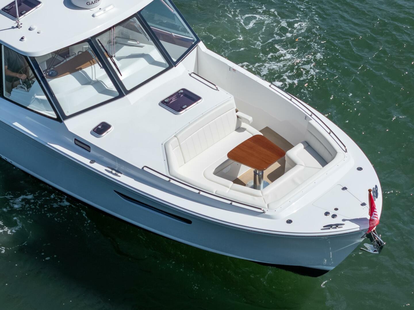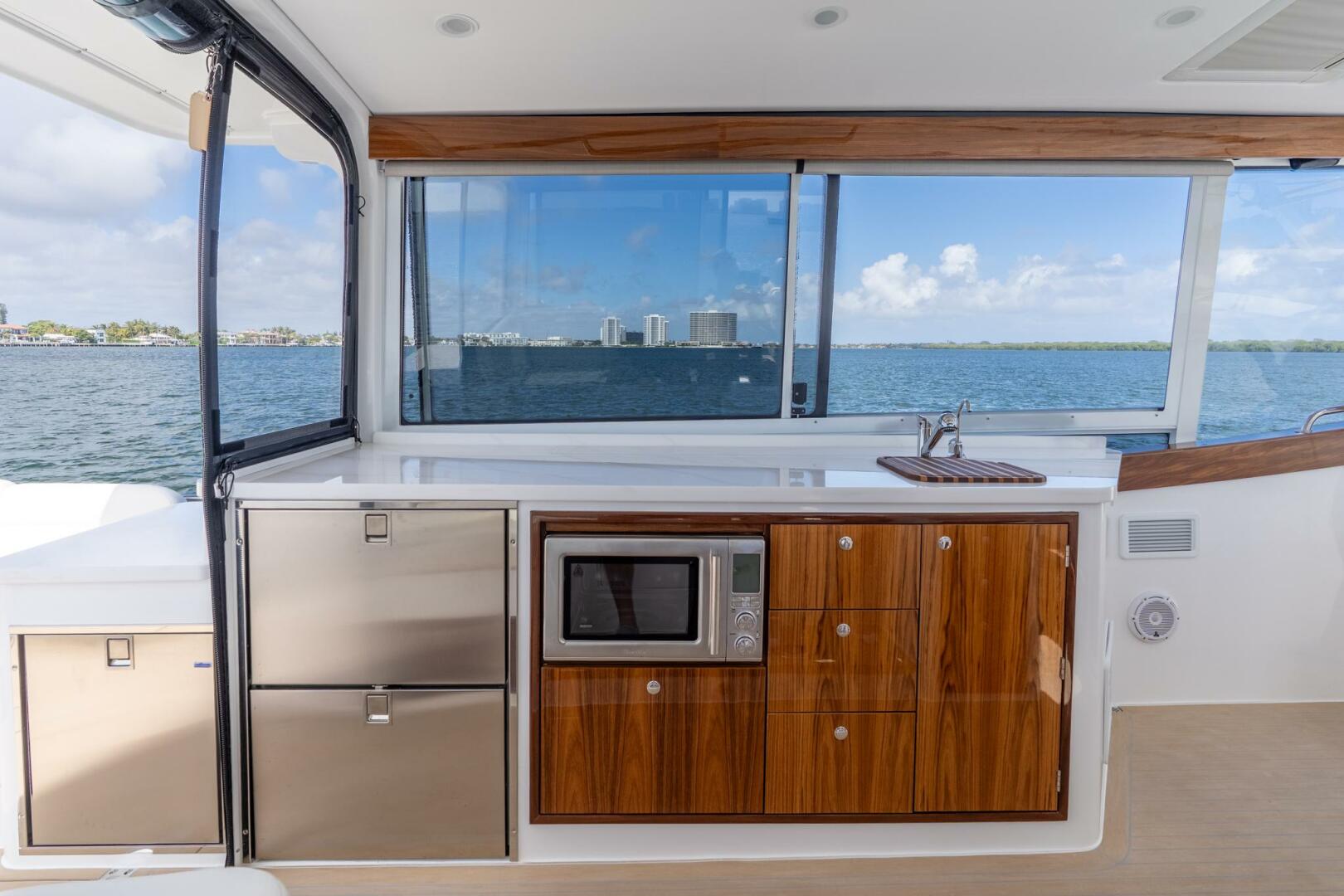 Below deck, the beautifully finished interior offers satin cherry cabinetry, Amtico walnut flooring, a convertible queen V-berth, and a comfortable amidships berth. The well-equipped galley features solid surface countertops, microwave, and drawer refrigeration.