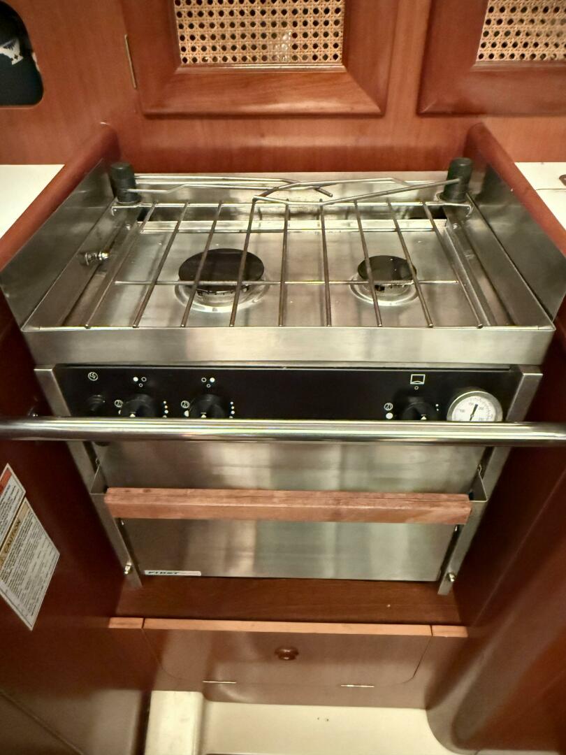 The U shaped galley has a gimballed 2 burner propane stove and oven, top and front loading refrigerator and freezer with Adler Barbour 12V refrigeration, microwave oven, double stainless steel sinks, and hot and cold pressured water. There is plenty of stowage and workspace.