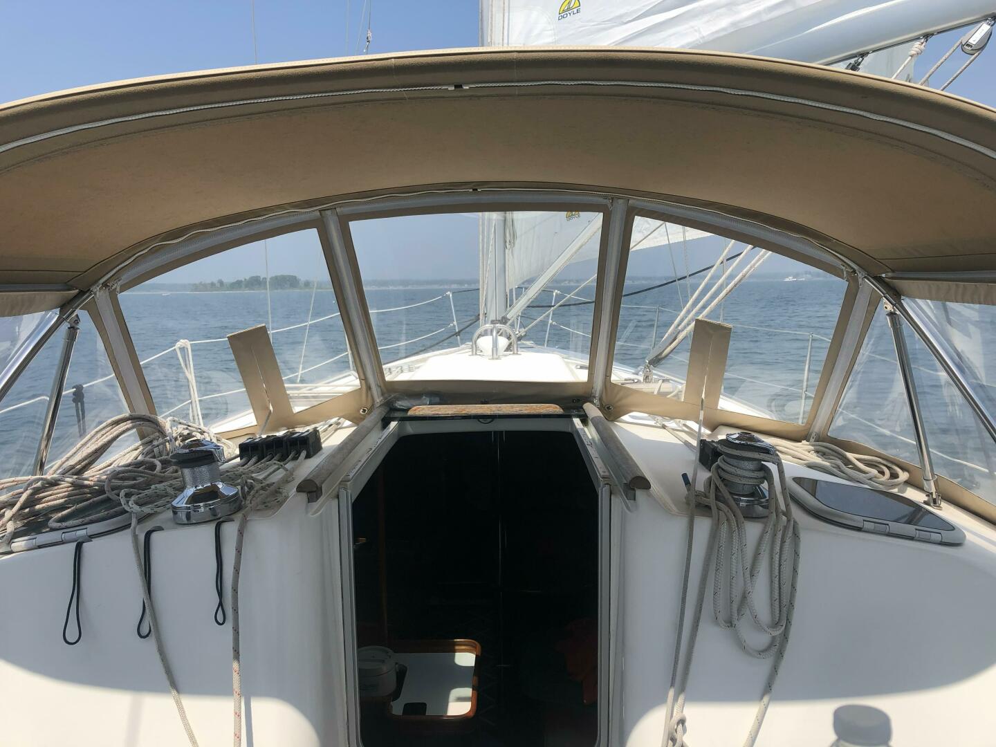 Solid fiberglass hull with structural inner grid. Large cockpit with sugar scoop transom and integrated swim platform. Teak in cockpit and on swim platform is clean and maintained annually. Full dodger and bimini with isinglass windows, connector, and sunshade attachments. Canvas is in great shape and isinglass is like new! Cockpit table folds up. All lines led aft to cockpit, with primary winches within reach of the helm. Two Lewmar 44 primary winches and two Lewmar 30 cabintop winches. Electric windlass with new windlass gypsy. Stainless steel stanchions, bow, and stern rails with coated lifelines and gates.