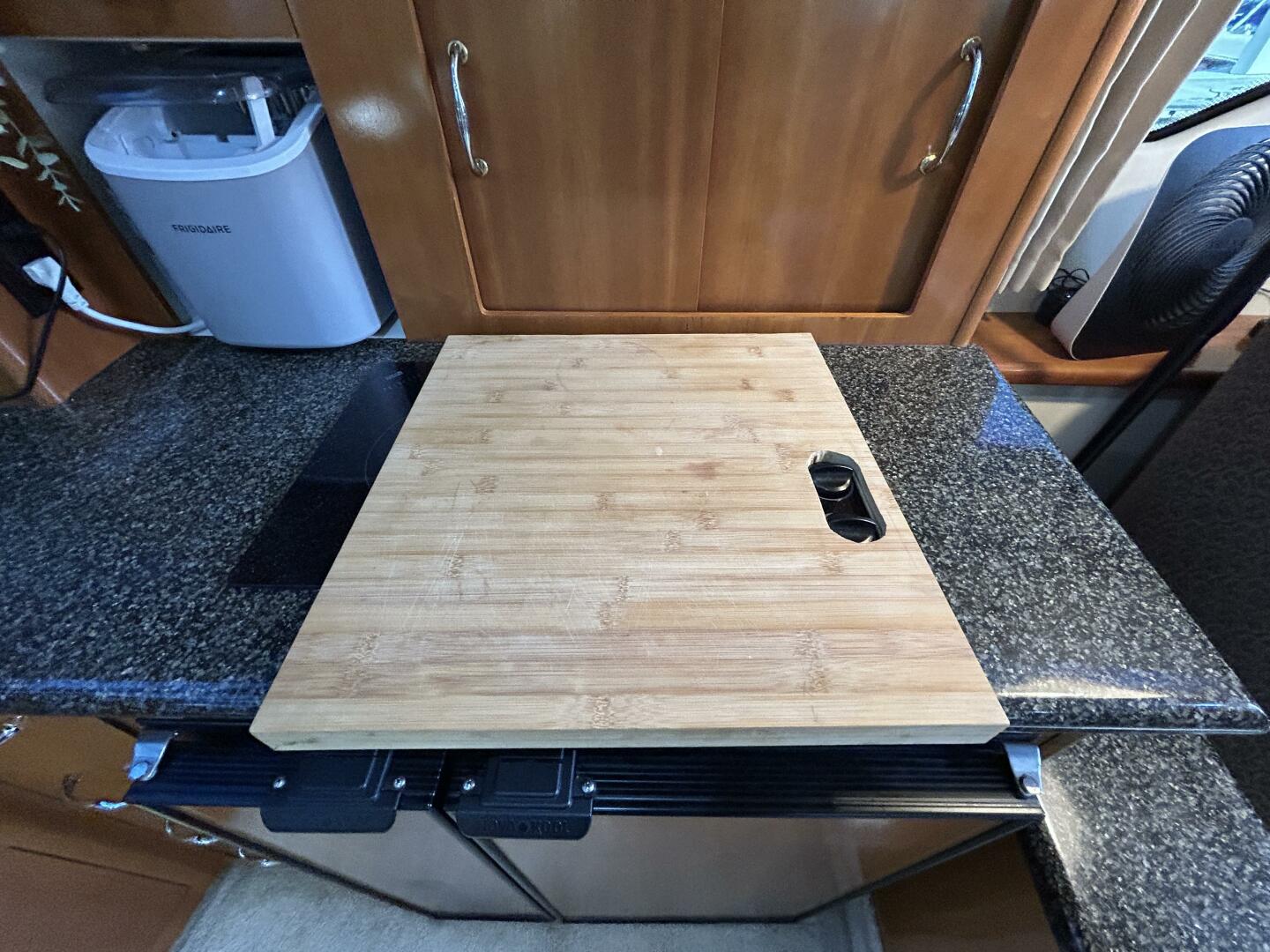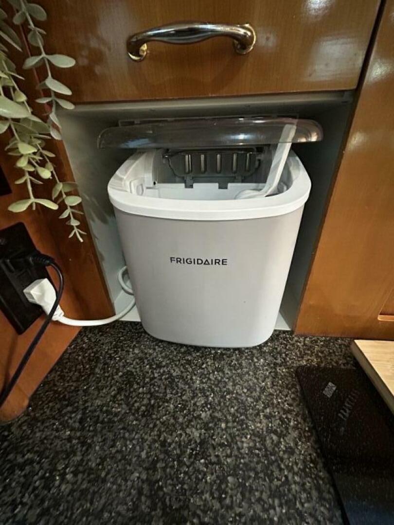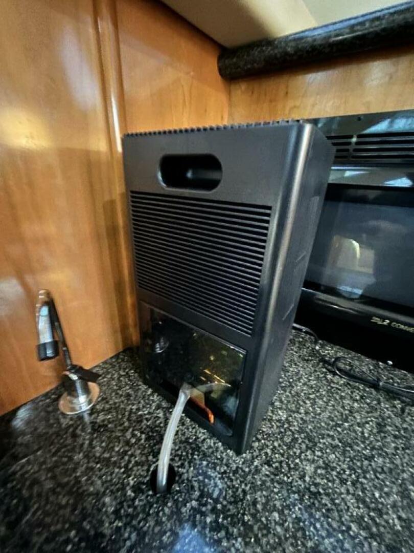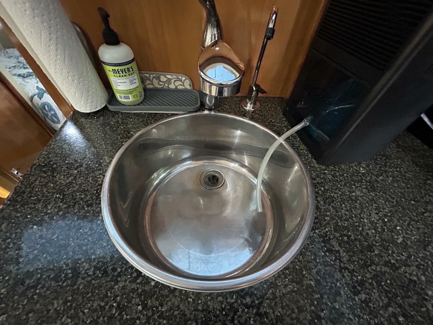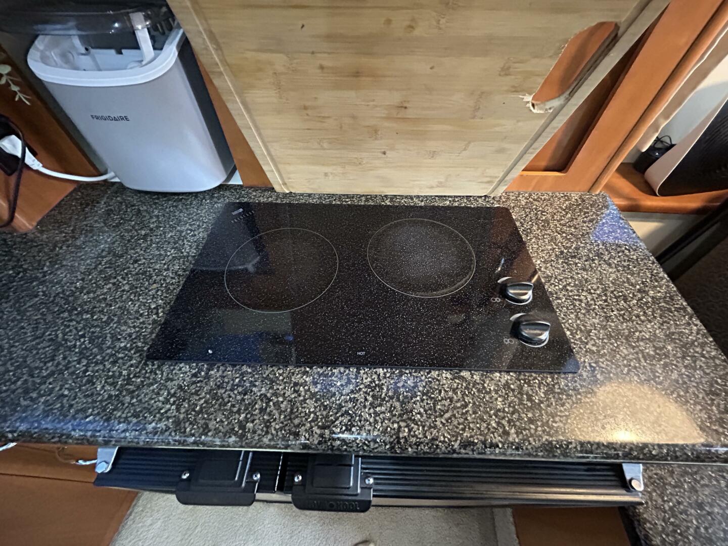 The salon offers full carpeted area, double-tier side windows with curtains, wrap-around seating with storage and a settee port that seats four, multispeed fan and a Insignia 32" flat screen TV with Soundbar & DVD player.