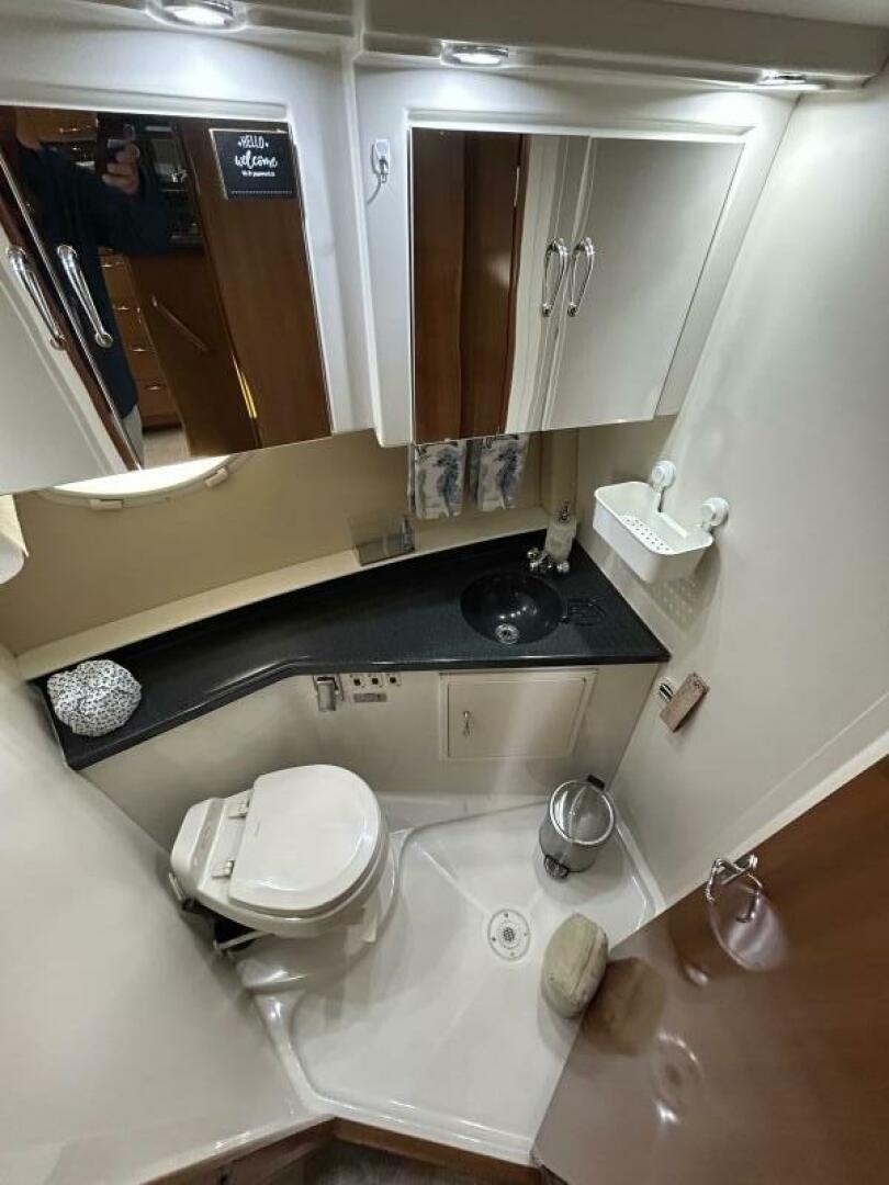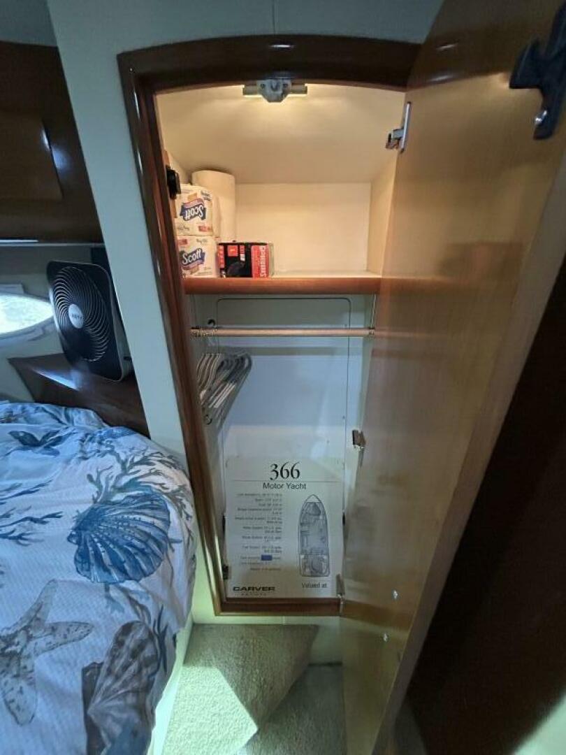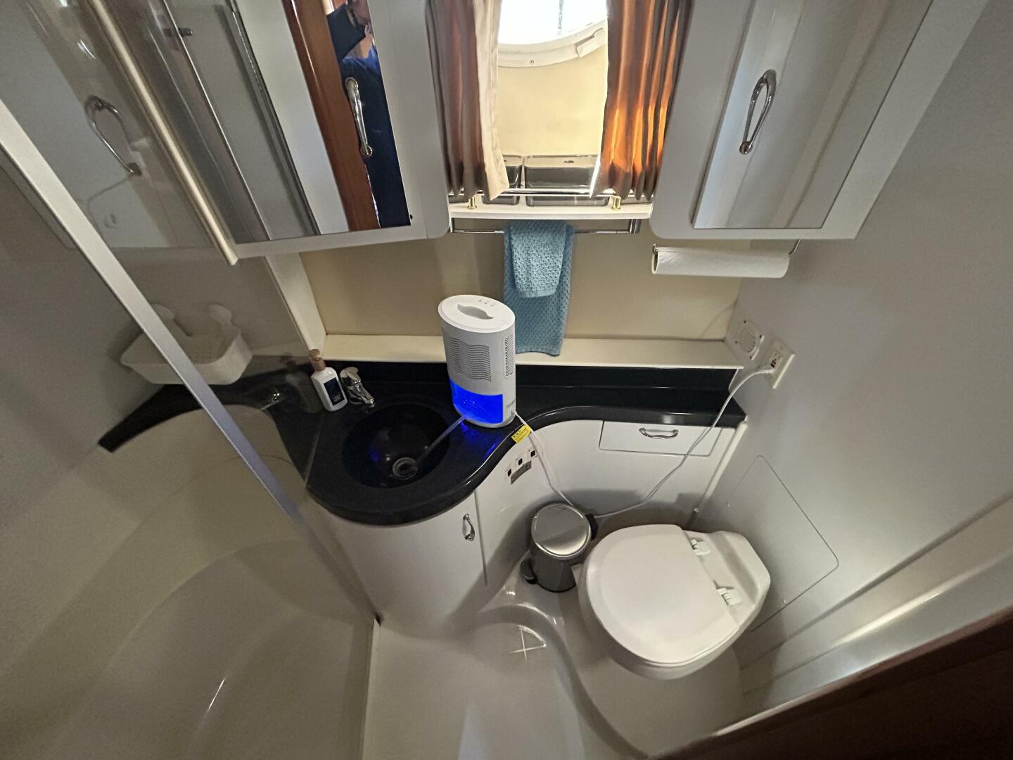 The primary stateroom offers an angled bert, nightstands, reading light, storage drawers, cabinets, hanging locker, fan, climate control, transom hatch w/ screen/shade. Flat screen 18" Sharp TV w/ DVD player. Enclosed head w/ shower to port.