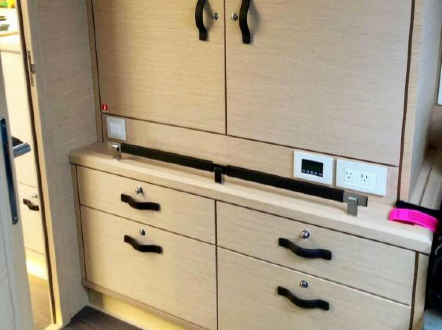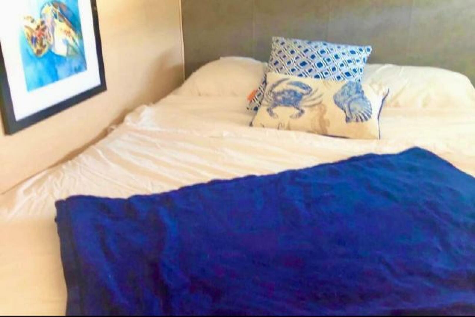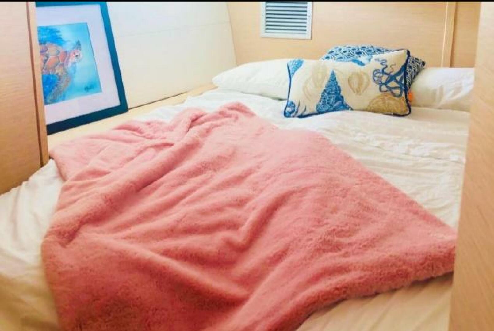 The Owner's Suite is located forward with a centreline queen, ensuite head with shower, and oversized ports above the bed. Aft to Port is the ViP Cabin with a queen berth, ensuite head and shower, and generous headroom. Aft to Starboard is the 3rd cabin with 2 twin berths and the day head just forward.