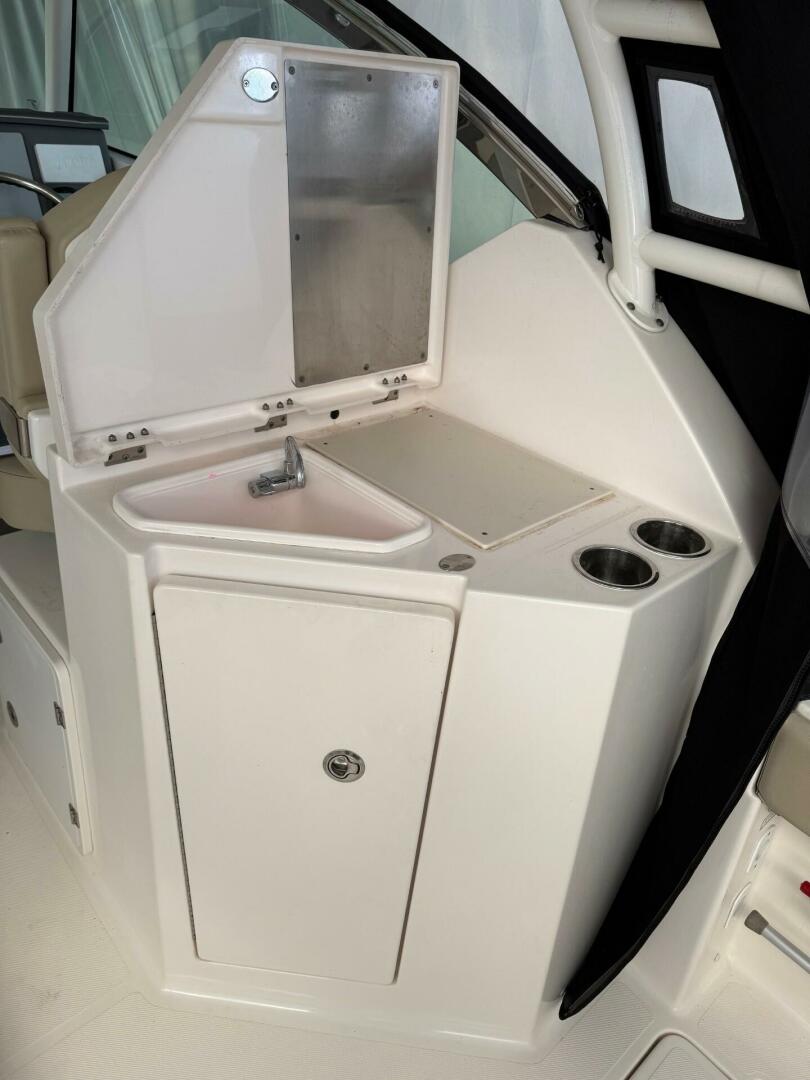 A nice example of the Pursuit DC 295 Dual Console, a practical, open design well-suited for today's boaters and with more comfort then a similar size center console. Boat is currently in winter storage and covered. The two In water photos shown here are of a close sistership.