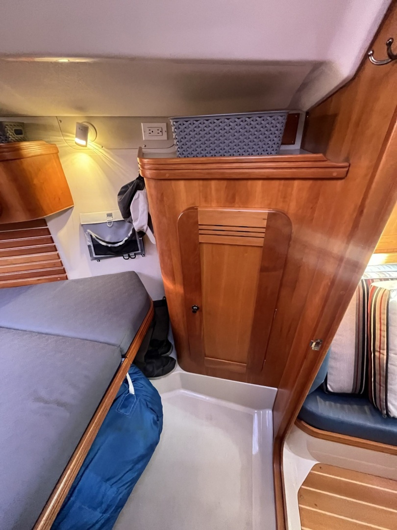 To port at the base of the companionway is the enclosed head with electric toilet. The aft end of the space is used for a shower and there is a bar for hanging wet weather gear.