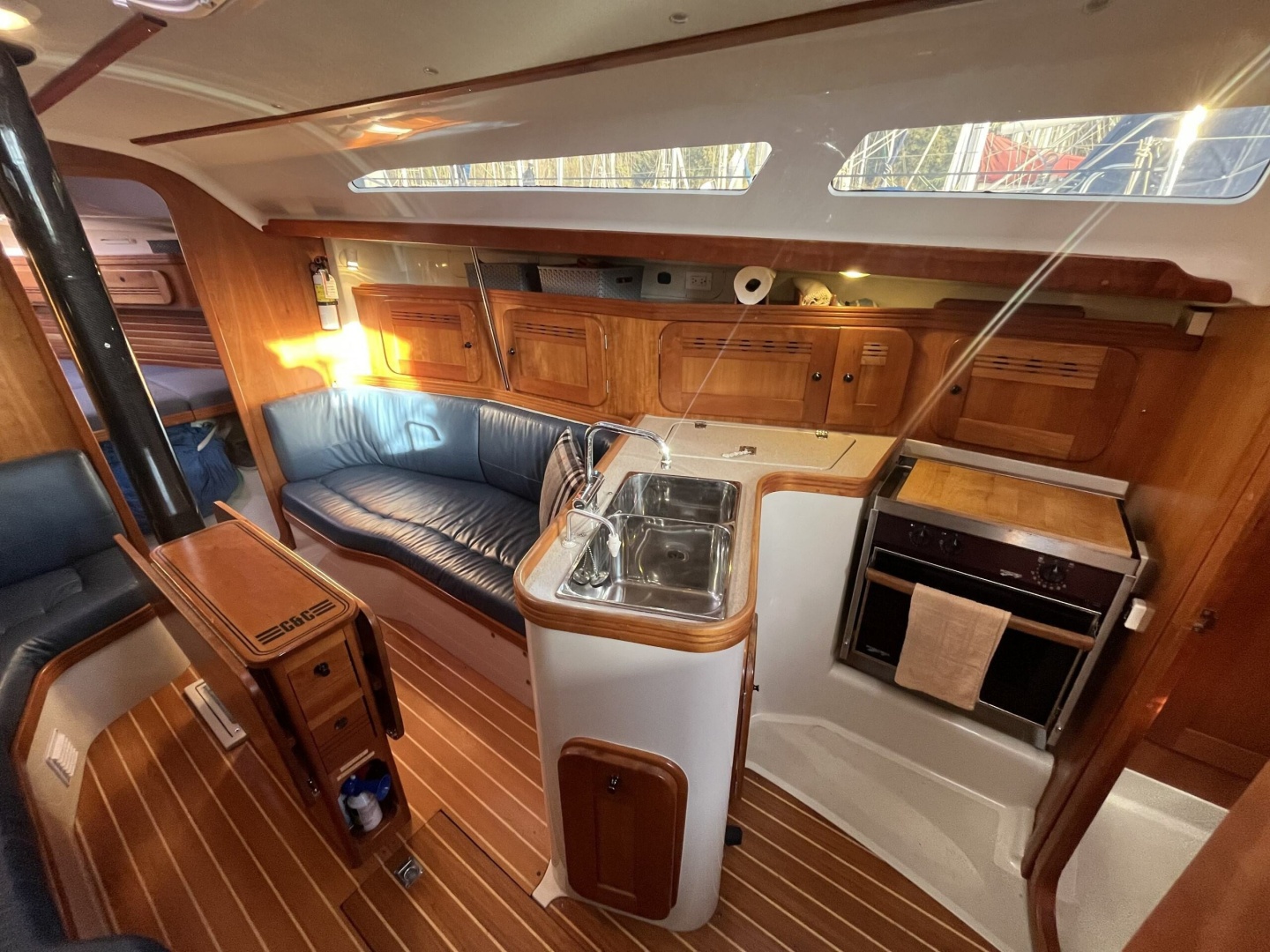 The interior of the C&C 110 is finished in satin cherry with a teak-and-holly cabin sole, giving the boat a bright and welcoming atmosphere. Fixed and opening ports flood the salon with natural light and enhance ventilation at anchor.
