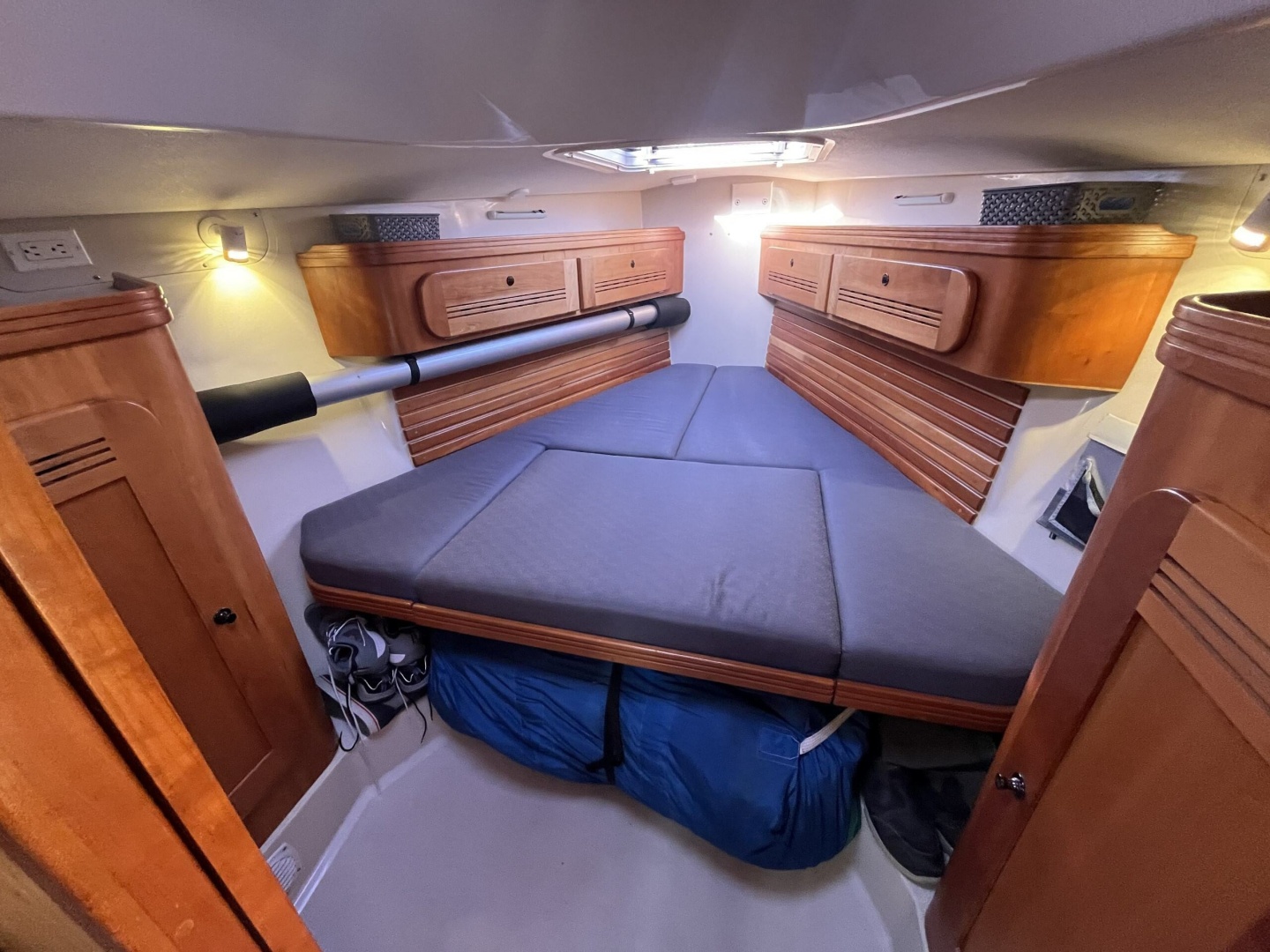The private forward cabin features a comfortably sized V-berth with ample storage lockers.