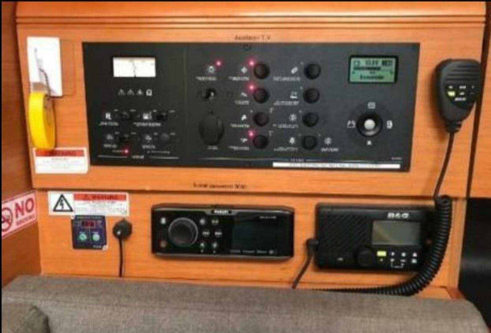 Her twin helm stations have two large steering wheels and provide top-quality instrumentation including autopilot, boat speed, depth, wind speed and direction. Color cartographic GPS is also mounted in the cockpit.
