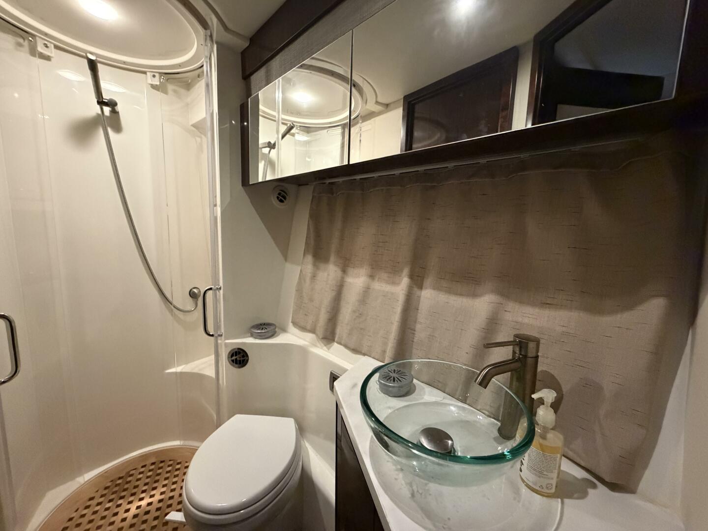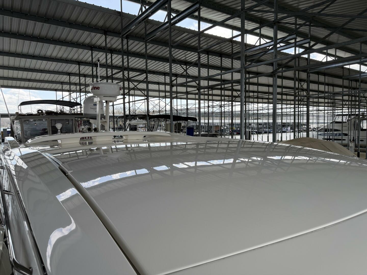 It’s a white hull with black canvas, Aft Isinglass Enclosure, Inverter System, Foredeck Audio, Windlass with SS anchor, Hydraulic Swim Platform, Electric Cockpit Awning, Mesh Windshield Shades, Custom Cockpit Refrigerator, Teak Cockpit Table, Bow Thruster, Inboard Joystick Docking System, Interior Stereo Upgrade, Dynamic Running Surface, Cockpit Cool Box, Underwater Lights, DSS Satellite System, Oil Change System, Fuel Transfer Pump, Factory Storage Cabinet in Aft Stateroom, Single Head Layout, TV’s in both Staterooms & Salon, Twin Raymarine Radar/Chart Screens, and U.S. Flag & SS base.