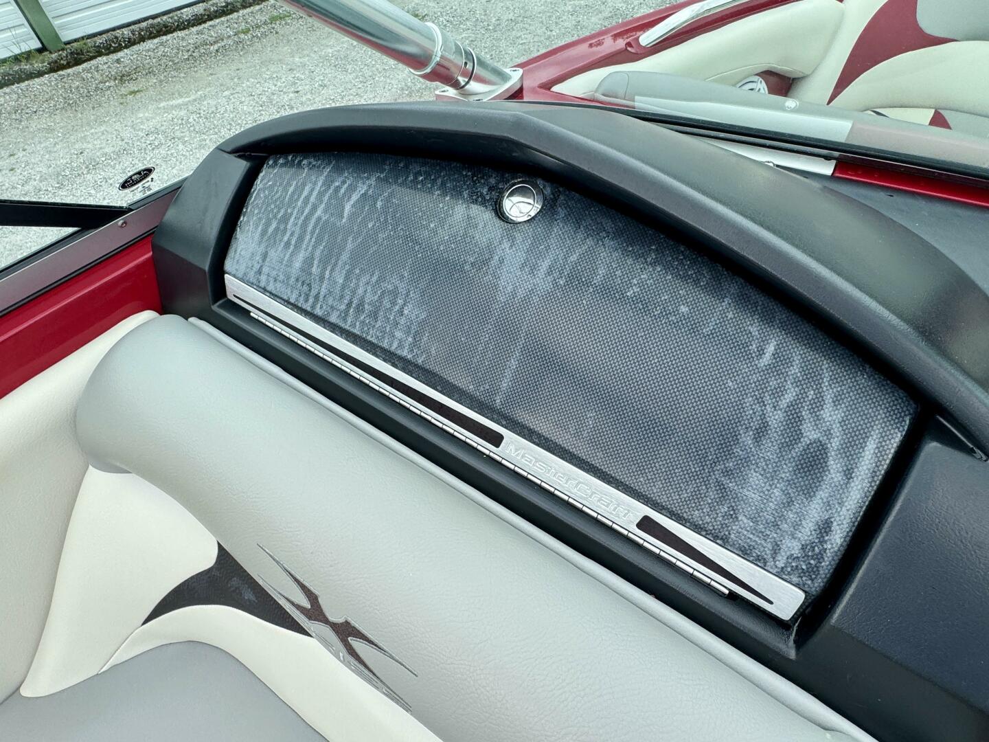 This One-Owner, Fresh Water, 2008 MasterCraft X-2 Wake Board & Wake Surf Boat For Sale near Norris Lake Tennessee is equipped with a 5.7L MCX Indmar Vortec 350 HO MPI ETXCat V-drive inboard engine and features MasterCraft's pickle-fork bow with a Zero-flex wakeboard tower w/dual swivel clamping ski/board racks, a rear-view mirror, bimini top, tower lights, docking lights, under-water lights, Gen2 surf tabs with the attitude adjustment plate and factory ballast tanks, a 3-outlet cockpit heater with heated driver and observer seats, PerfectPass wakeboard pro cruise control with an integrated depth finder, air/water temperature displays, ballast, and tab status displays, a Clarion AM/FM/CD/Aux Input stereo with (2)JL Audio amplifiers, a JL Audio subwoofer, (8)JL Audio speaker/tweeters throughout (4-cockpit/4-tower), a removable igloo cooler w/dedicated under-seat storage, snap-in cockpit carpeting (not shown), a mooring cover, integrated bow wind-block, dual batteries with a battery switch, a matching tandem axle trailer with brakes, a spare tire, and a swing tongue is included and much more!