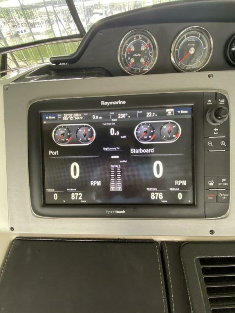 Come and see "Yonder Star" one of Sea Ray's best-selling Fly bridge models sitting on the TN River in a covered slip! This boat is a must see from its long list of options and upgrades to its glossy gel coat! It only has 880hrs on Cummins 600 Zeus that features skyhook, auto pilot and Joystick docking. This 510Fly is packed with upgrades and options, she has the extended hard top with electric sunroof, 3 bridge AC units, newer acrylic canvas enclosure, bridge grill, bridge fridge, 2 high gloss wood tables, and plenty of seating for a crowd. Both upper and lower helms have dual Raymarine chart-plotters, FLIR, backup & engine cameras, VHF radios, and smart craft vessel view. It has the high gloss cherry interior, hard wood floors, 4 drawer style fridge/freezers in the galley along with convention oven and 2 burner cooktop. Master stateroom and salon has the Bose surround sound system and smart TV's for entertainment. Up on the bow you have a windlass with SS anchor, 2 lounger style sun-pads, and snap-on windshield covers. The cockpit has blue and white lighting, teak cockpit, underwater blue & white lights, and hydraulic platform lift.